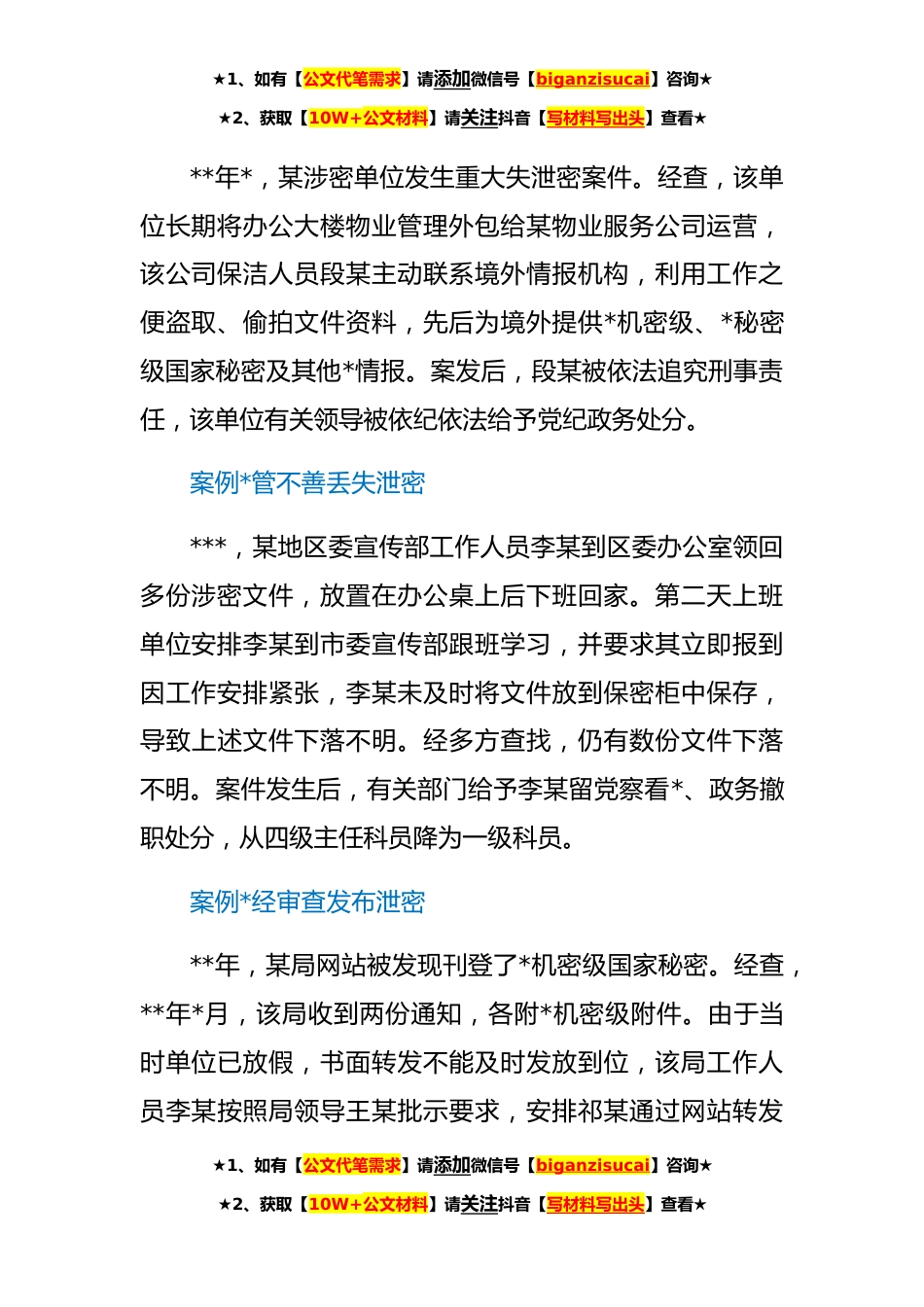 ★1、如有【公文代笔需求】请添加微信号【biganzisucai】咨询★★2、获取【10W+公文材料】请关注抖音【写材料写出头】查看★剖析典型案例提升保密意识随着信息化的快速发展,泄密的途径越来越多,特别是*泄密呈高发频发态势,可以说是疏忽一闪念、失密一瞬间、后悔一辈子。为进一步提高全体党员的保密意识,近期,市国家保密局在网上搜集整理了部分典型泄密案例,对*群和疫情期间的保密管理提出要求,供大家传达学习,并举一反三,引以为戒。一、典型泄密案例案例*酬优厚拍照泄密**年*,*岁的张某在*上添加了一个自称“记者”的人。此人以需要新闻报道材料为由,请张某为其提供军舰照片张某被优厚条件吸引,想方设法进行拍摄。在境外间谍机关的指使下,张某设法进入某军工企业。到**年*被采取强制措施时,张某已向...