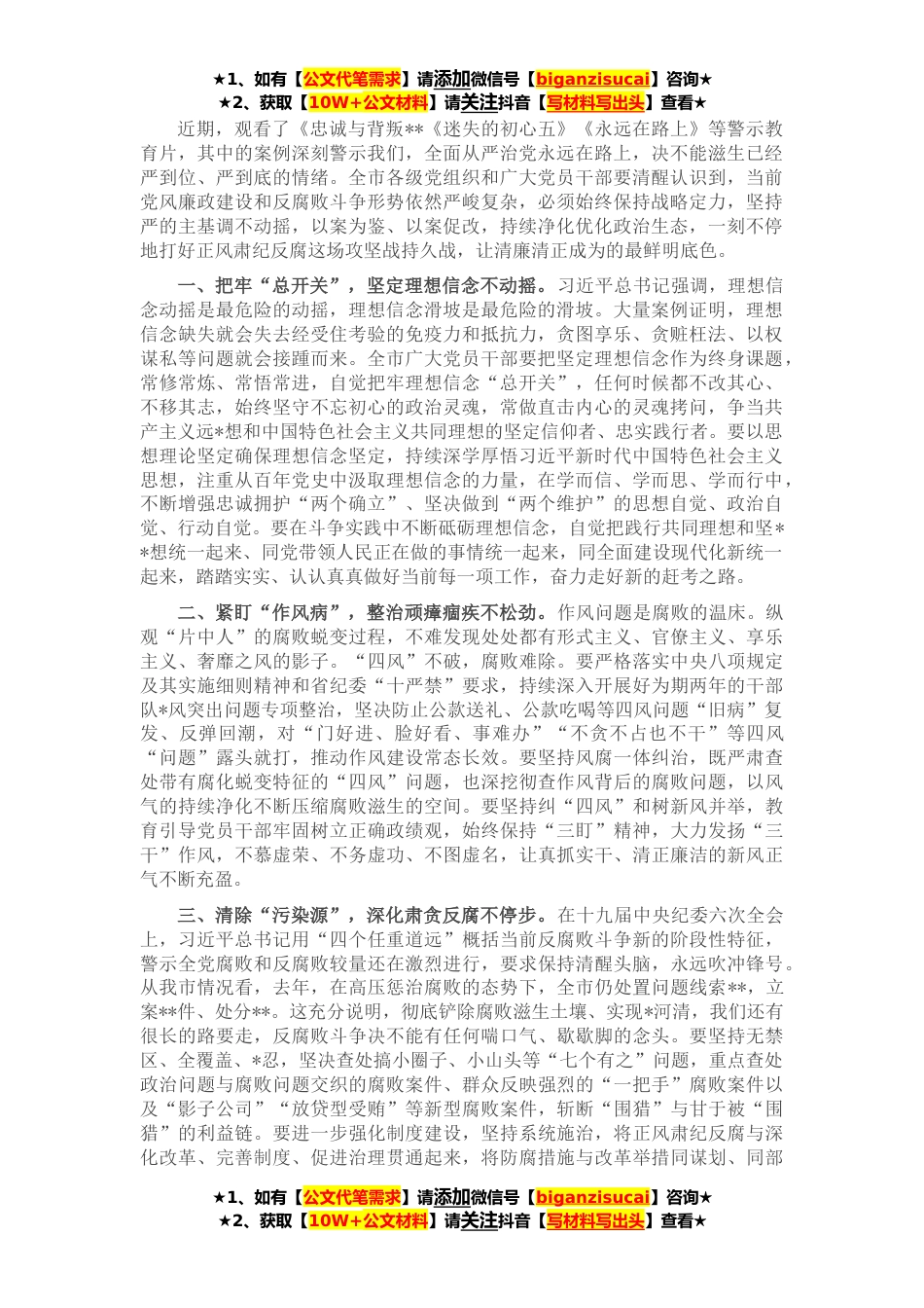 ★1、如有【公文代笔需求】请添加微信号【biganzisucai】咨询★★2、获取【10W+公文材料】请关注抖音【写材料写出头】查看★近期,观看了《忠诚与背叛**《迷失的初心五》《永远在路上》等警示教育片,其中的案例深刻警示我们,全面从严治党永远在路上,决不能滋生已经严到位、严到底的情绪。全市各级党组织和广大党员干部要清醒认识到,当前党风廉政建设和反腐败斗争形势依然严峻复杂,必须始终保持战略定力,坚持严的主基调不动摇,以案为鉴、以案促改,持续净化优化政治生态,一刻不停地打好正风肃纪反腐这场攻坚战持久战,让清廉清正成为的最鲜明底色。一、把牢“总开关”,坚定理想信念不动摇。习近平总书记强调,理想信念动摇是最危险的动摇,理想信念滑坡是最危险的滑坡。大量案例证明,理想信念缺失就会失...