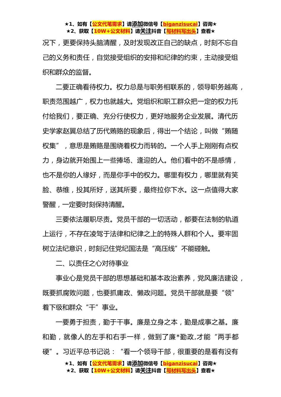 ★1、如有【公文代笔需求】请添加微信号【biganzisucai】咨询★★2、获取【10W+公文材料】请关注抖音【写材料写出头】查看★在公司党员干部集体廉洁谈话会上的讲话同志们:对党员干部进行廉洁谈话,是党内监督的一项重要制度,是提醒和预防腐败的一种手段,也是组织对大家的关心和爱护。今天,我们以集体谈话形式进行廉洁谈话,这既是与大家一起学习勉励的过程,更是警示教育的过程。希望同志们不断增强勤政廉洁意识,保持清醒头脑,从严要求自己,做忠诚干净担当干事的模范。下面,我讲三点意见。一、以敬畏之心对待权力权力意味着责任。权力是一把双刃剑,用来为民服务,可以成就人生;用来为己谋私,则最终伤害自己,甚至会毁了一生。所以,我们要时刻保持清醒,慎权畏权,守住底线,一门心思把权力用在干事创业...