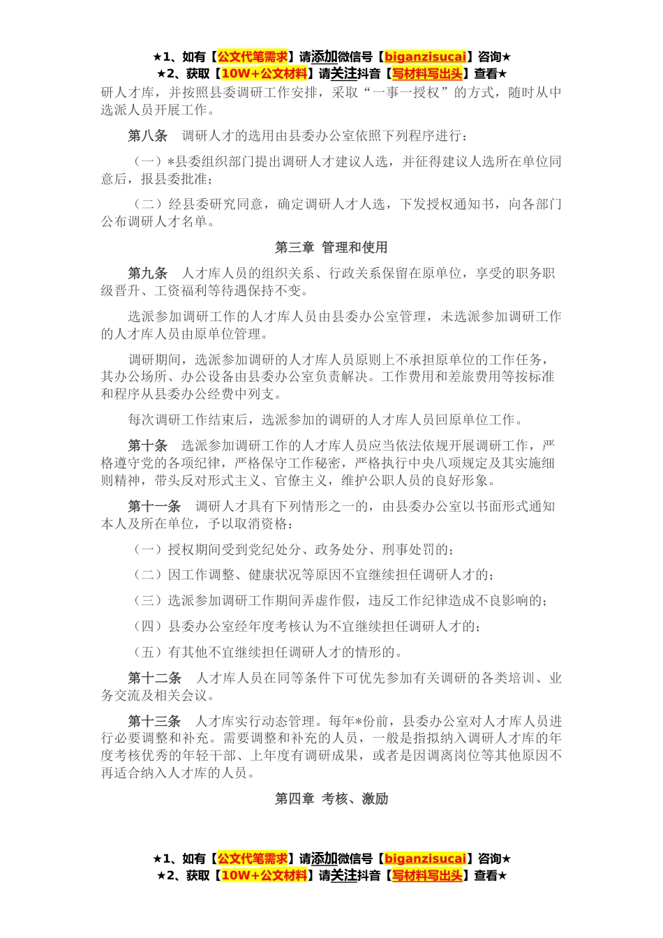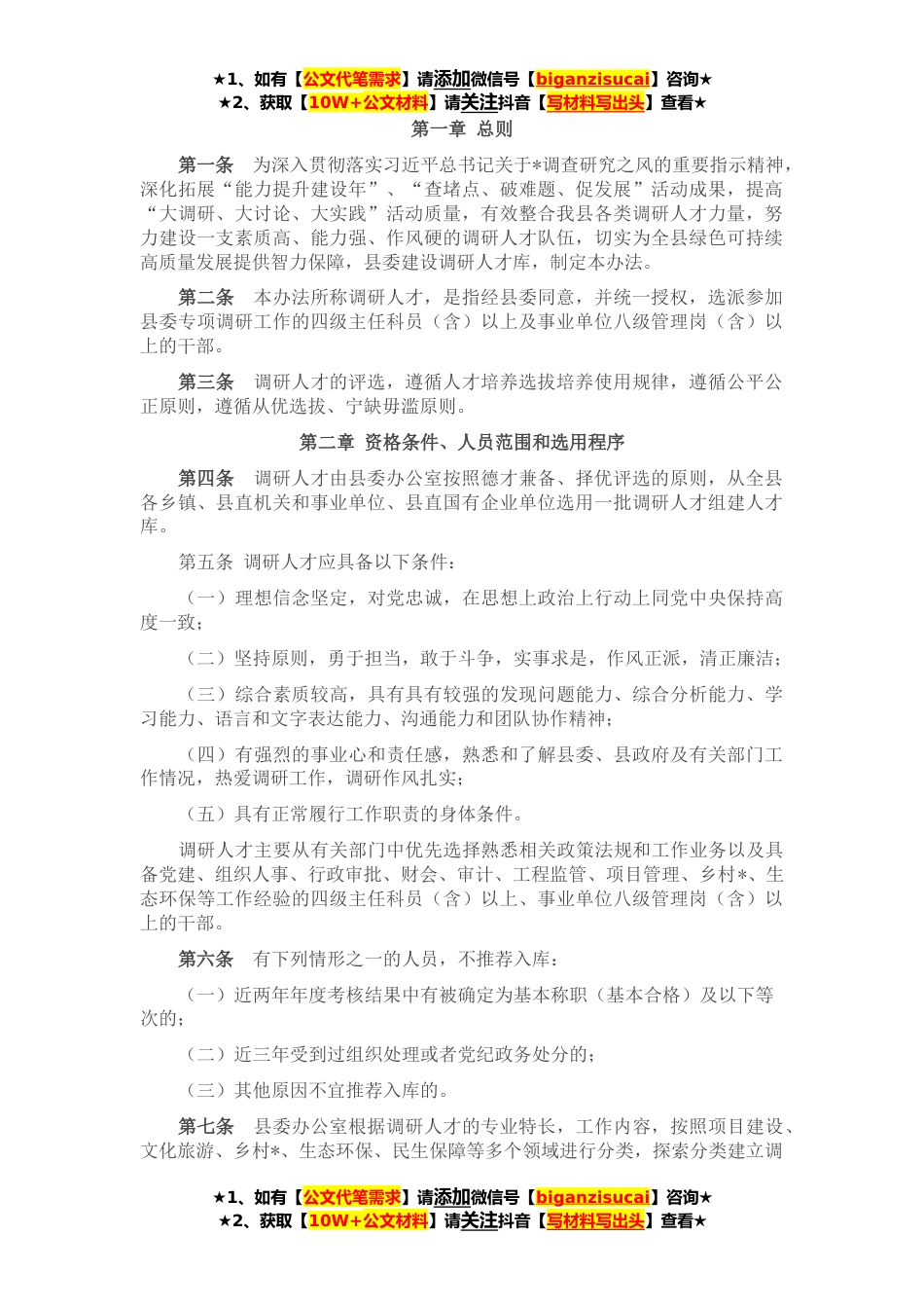 ★1、如有【公文代笔需求】请添加微信号【biganzisucai】咨询★★2、获取【10W+公文材料】请关注抖音【写材料写出头】查看★第一章总则第一条为深入贯彻落实习近平总书记关于*调查研究之风的重要指示精神,深化拓展“能力提升建设年”、“查堵点、破难题、促发展”活动成果,提高“大调研、大讨论、大实践”活动质量,有效整合我县各类调研人才力量,努力建设一支素质高、能力强、作风硬的调研人才队伍,切实为全县绿色可持续高质量发展提供智力保障,县委建设调研人才库,制定本办法。第二条本办法所称调研人才,是指经县委同意,并统一授权,选派参加县委专项调研工作的四级主任科员(含)以上及事业单位八级管理岗(含)以上的干部。第三条调研人才的评选,遵循人才培养选拔培养使用规律,遵循公平公正原则,遵...