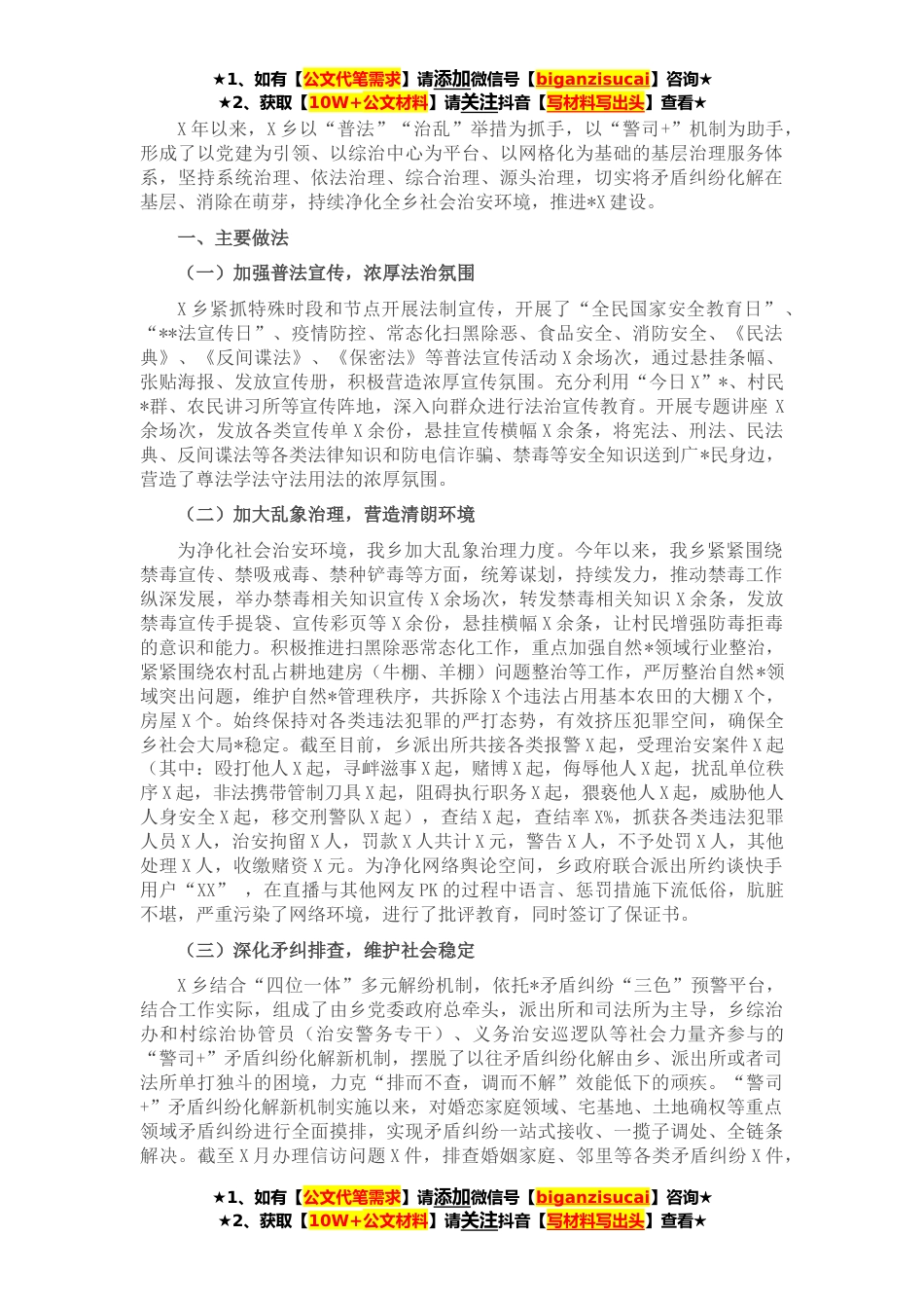 ★1、如有【公文代笔需求】请添加微信号【biganzisucai】咨询★★2、获取【10W+公文材料】请关注抖音【写材料写出头】查看★X年以来,X乡以“普法”“治乱”举措为抓手,以“警司+”机制为助手,形成了以党建为引领、以综治中心为平台、以网格化为基础的基层治理服务体系,坚持系统治理、依法治理、综合治理、源头治理,切实将矛盾纠纷化解在基层、消除在萌芽,持续净化全乡社会治安环境,推进*X建设。一、主要做法(一)加强普法宣传,浓厚法治氛围X乡紧抓特殊时段和节点开展法制宣传,开展了“全民国家安全教育日”、“**法宣传日”、疫情防控、常态化扫黑除恶、食品安全、消防安全、《民法典》、《反间谍法》、《保密法》等普法宣传活动X余场次,通过悬挂条幅、张贴海报、发放宣传册,积极营造浓厚宣传氛围。充...