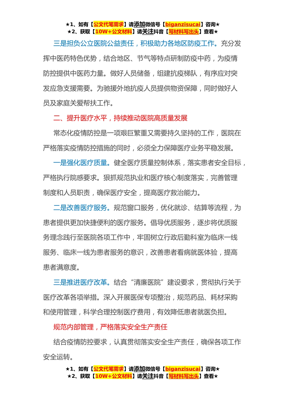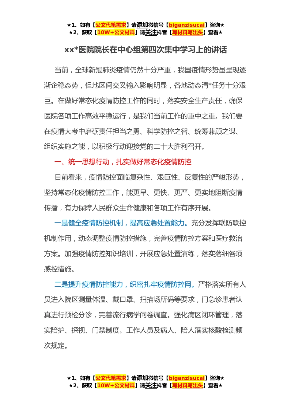 ★1、如有【公文代笔需求】请添加微信号【biganzisucai】咨询★★2、获取【10W+公文材料】请关注抖音【写材料写出头】查看★xx*医院院长在中心组第四次集中学习上的讲话当前,全球新冠肺炎疫情仍然十分严重,我国疫情形势虽呈现逐渐企稳态势,但地区间交叉输入影响明显,各地动态清*任务十分艰巨。在做好常态化疫情防控工作的同时,落实安全生产责任,确保医院各项工作高效平稳运行,是我们当前工作的重中之重。我们要在疫情大考中磨砺责任担当之勇、科学防控之智、统筹兼顾之谋、组织实施之能,以积极行动迎接党的二十大胜利召开。一、统一思想行动,扎实做好常态化疫情防控目前看来,疫情防控面临复杂性、艰巨性、反复性的严峻形势,坚持常态化疫情防控工作,能更早、更快、更严、更实地阻断疫情传播,有力保障...
