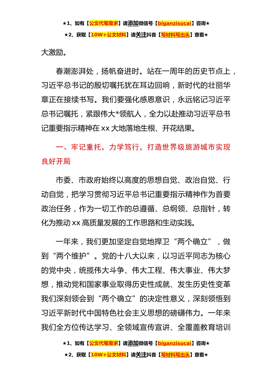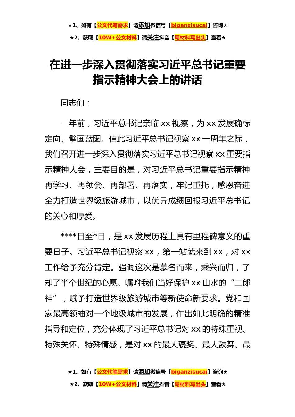 ★1、如有【公文代笔需求】请添加微信号【biganzisucai】咨询★★2、获取【10W+公文材料】请关注抖音【写材料写出头】查看★在进一步深入贯彻落实习近平总书记重要指示精神大会上的讲话同志们:一年前,习近平总书记亲临xx视察,为xx发展确标定向、擘画蓝图。值此习近平总书记视察xx一周年之际,我们召开进一步深入贯彻落实习近平总书记视察xx重要指示精神大会,主要目的是,对习近平总书记重要指示精神再学习、再领会、再部署、再落实,牢记重托,感恩奋进全力打造世界级旅游城市,以优异成绩回报习近平总书记的关心和厚爱。****日至*日,是xx发展历程上具有里程碑意义的重要日子。习近平总书记视察xx,第一站就来到xx,对xx工作给予充分肯定。强调这次是慕名而来,乘兴而归,了却了半个世纪的心愿。嘱咐我们当好...