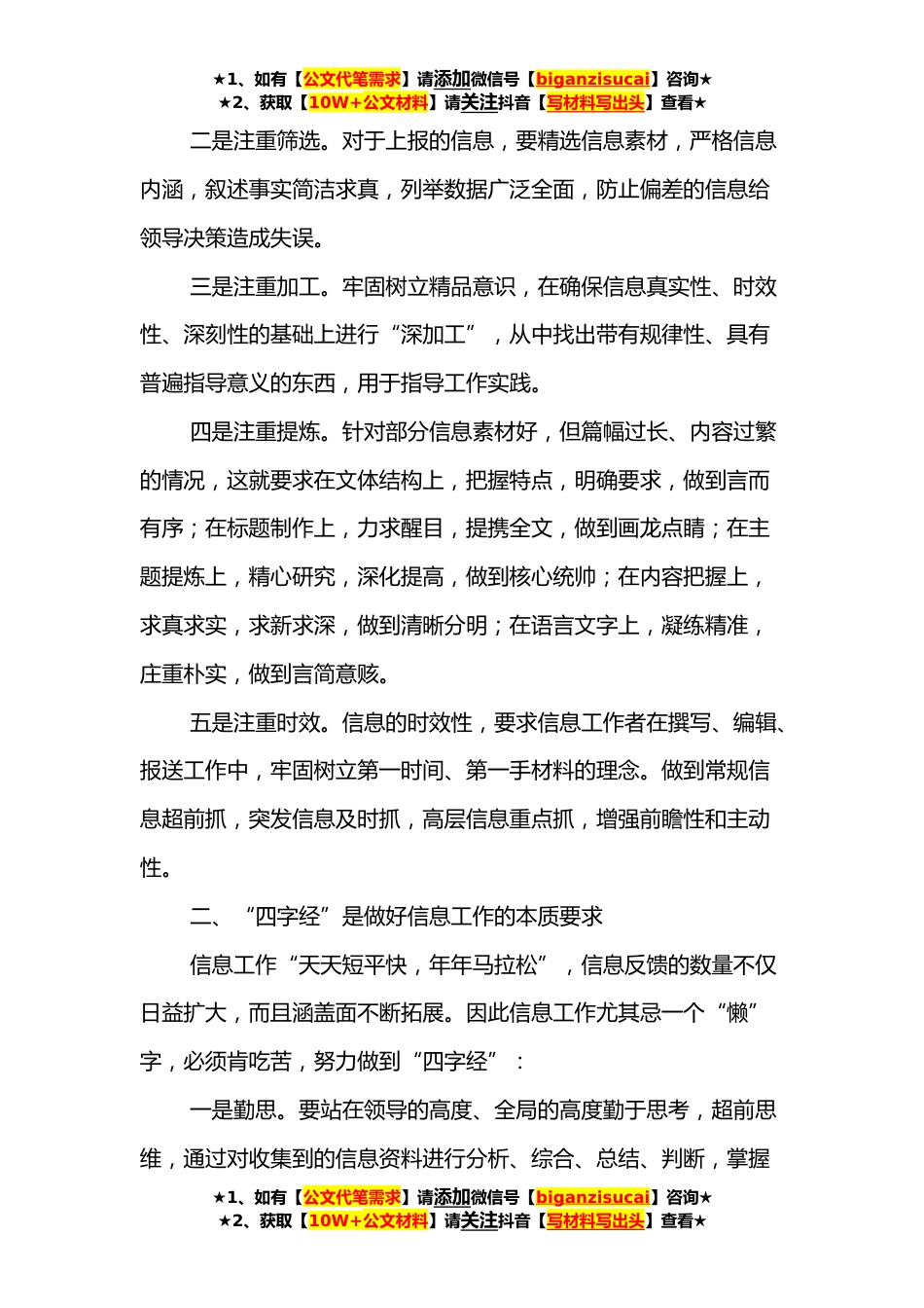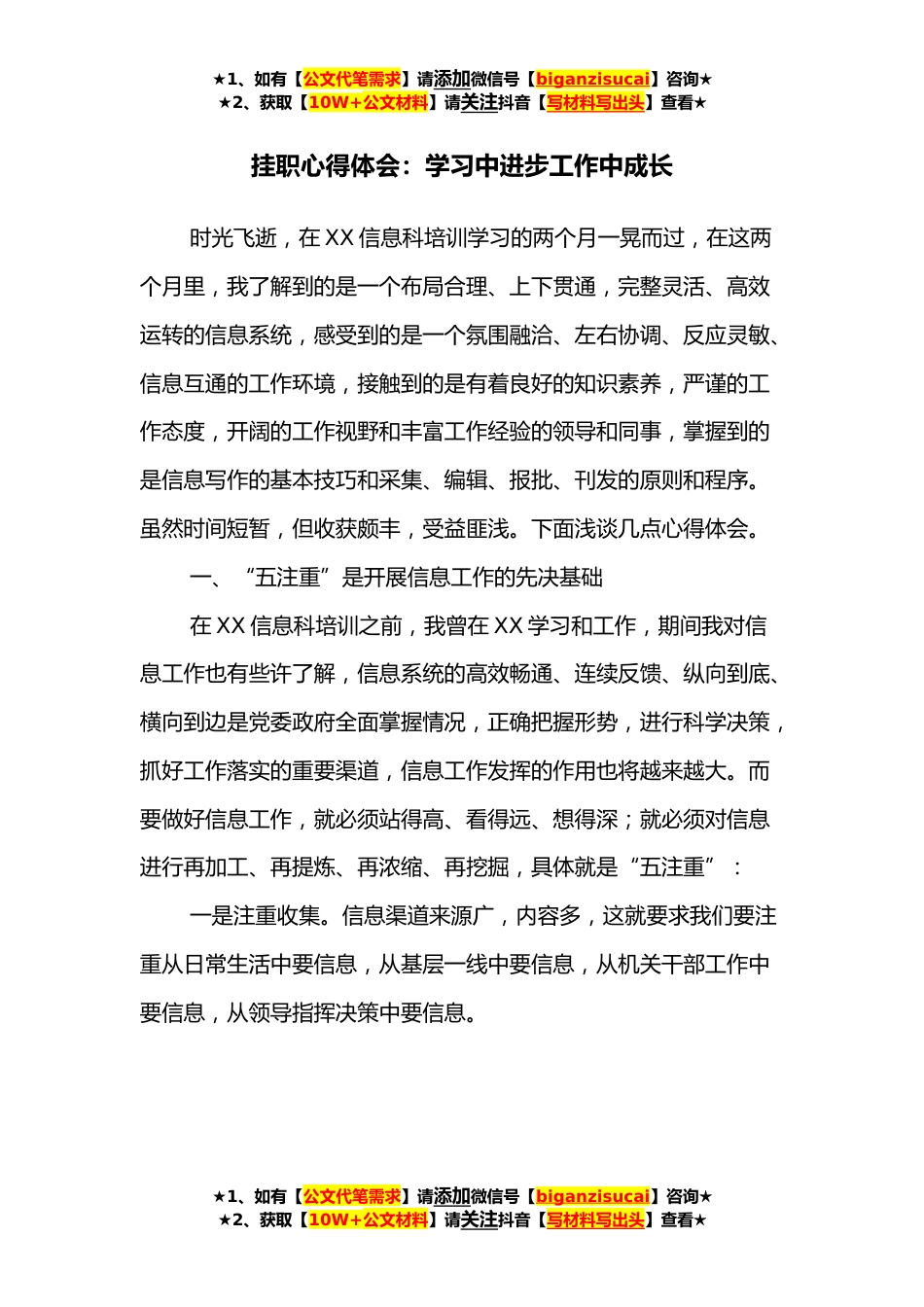 ★1、如有【公文代笔需求】请添加微信号【biganzisucai】咨询★★2、获取【10W+公文材料】请关注抖音【写材料写出头】查看★挂职心得体会:学习中进步工作中成长时光飞逝,在XX信息科培训学习的两个月一晃而过,在这两个月里,我了解到的是一个布局合理、上下贯通,完整灵活、高效运转的信息系统,感受到的是一个氛围融洽、左右协调、反应灵敏、信息互通的工作环境,接触到的是有着良好的知识素养,严谨的工作态度,开阔的工作视野和丰富工作经验的领导和同事,掌握到的是信息写作的基本技巧和采集、编辑、报批、刊发的原则和程序。虽然时间短暂,但收获颇丰,受益匪浅。下面浅谈几点心得体会。一、“五注重”是开展信息工作的先决基础在XX信息科培训之前,我曾在XX学习和工作,期间我对信息工作也有些许了解,信...