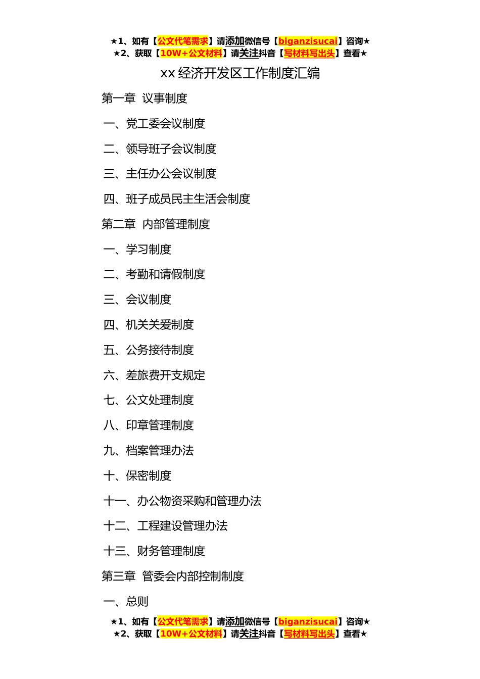 ★1、如有【公文代笔需求】请添加微信号【biganzisucai】咨询★★2、获取【10W+公文材料】请关注抖音【写材料写出头】查看★xx经济开发区工作制度汇编第一章议事制度一、党工委会议制度二、领导班子会议制度三、主任办公会议制度四、班子成员民主生活会制度第二章内部管理制度一、学习制度二、考勤和请假制度三、会议制度四、机关关爱制度五、公务接待制度六、差旅费开支规定七、公文处理制度八、印章管理制度九、档案管理办法十、保密制度十一、办公物资采购和管理办法十二、工程建设管理办法十三、财务管理制度第三章管委会内部控制制度一、总则★1、如有【公文代笔需求】请添加微信号【biganzisucai】咨询★★2、获取【10W+公文材料】请关注抖音【写材料写出头】查看★★1、如有【公文代笔需求】请添加微信号【...