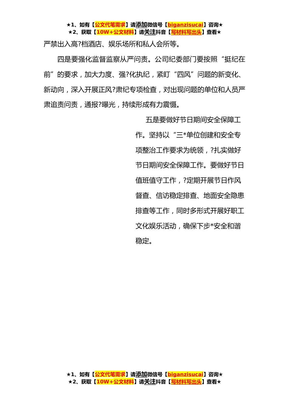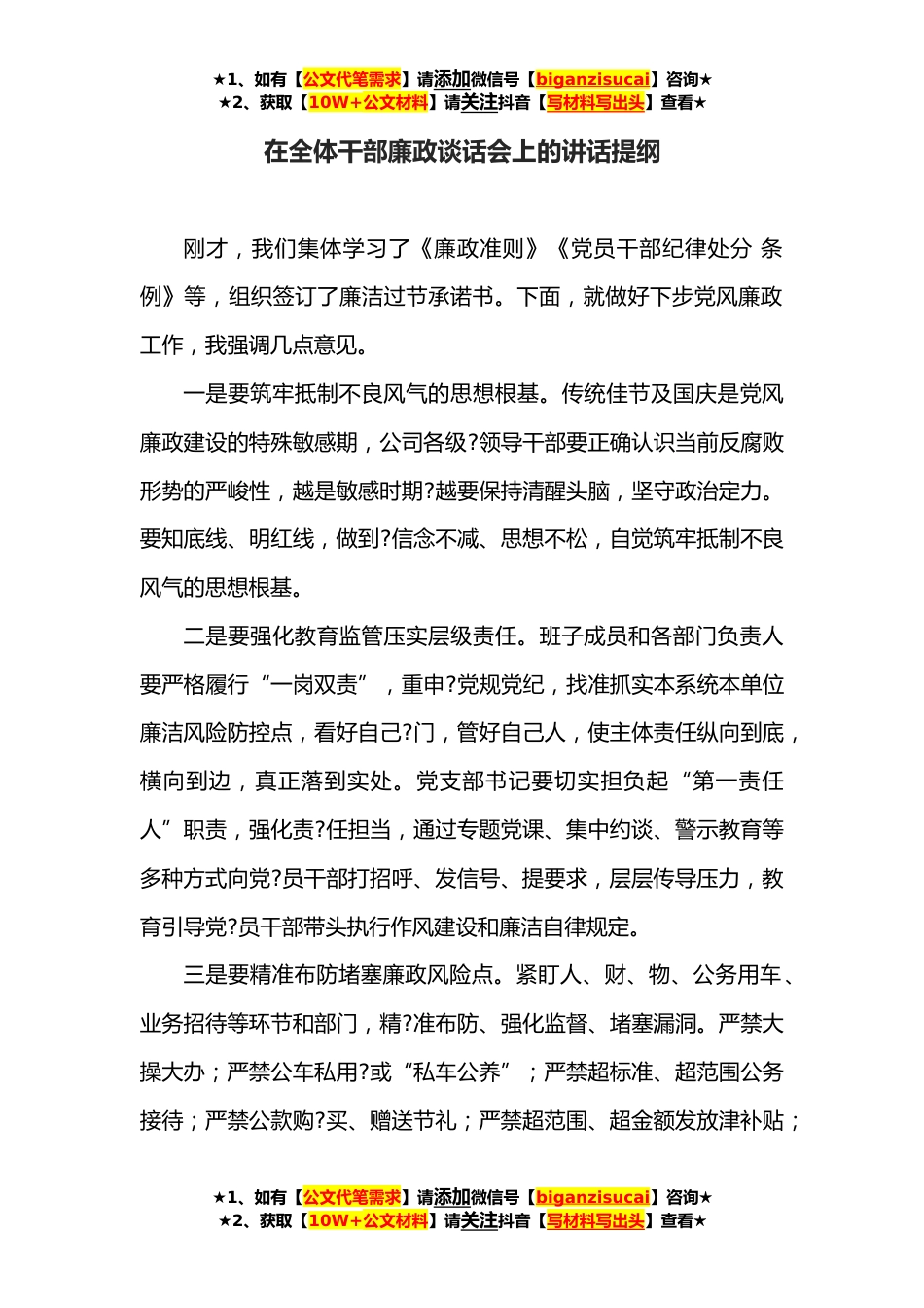 ★1、如有【公文代笔需求】请添加微信号【biganzisucai】咨询★★2、获取【10W+公文材料】请关注抖音【写材料写出头】查看★在全体干部廉政谈话会上的讲话提纲刚才,我们集体学习了《廉政准则》《党员干部纪律处分条例》等,组织签订了廉洁过节承诺书。下面,就做好下步党风廉政工作,我强调几点意见。一是要筑牢抵制不良风气的思想根基。传统佳节及国庆是党风廉政建设的特殊敏感期,公司各级?领导干部要正确认识当前反腐败形势的严峻性,越是敏感时期?越要保持清醒头脑,坚守政治定力。要知底线、明红线,做到?信念不减、思想不松,自觉筑牢抵制不良风气的思想根基。二是要强化教育监管压实层级责任。班子成员和各部门负责人要严格履行“一岗双责”,重申?党规党纪,找准抓实本系统本单位廉洁风险防控点,看好自...