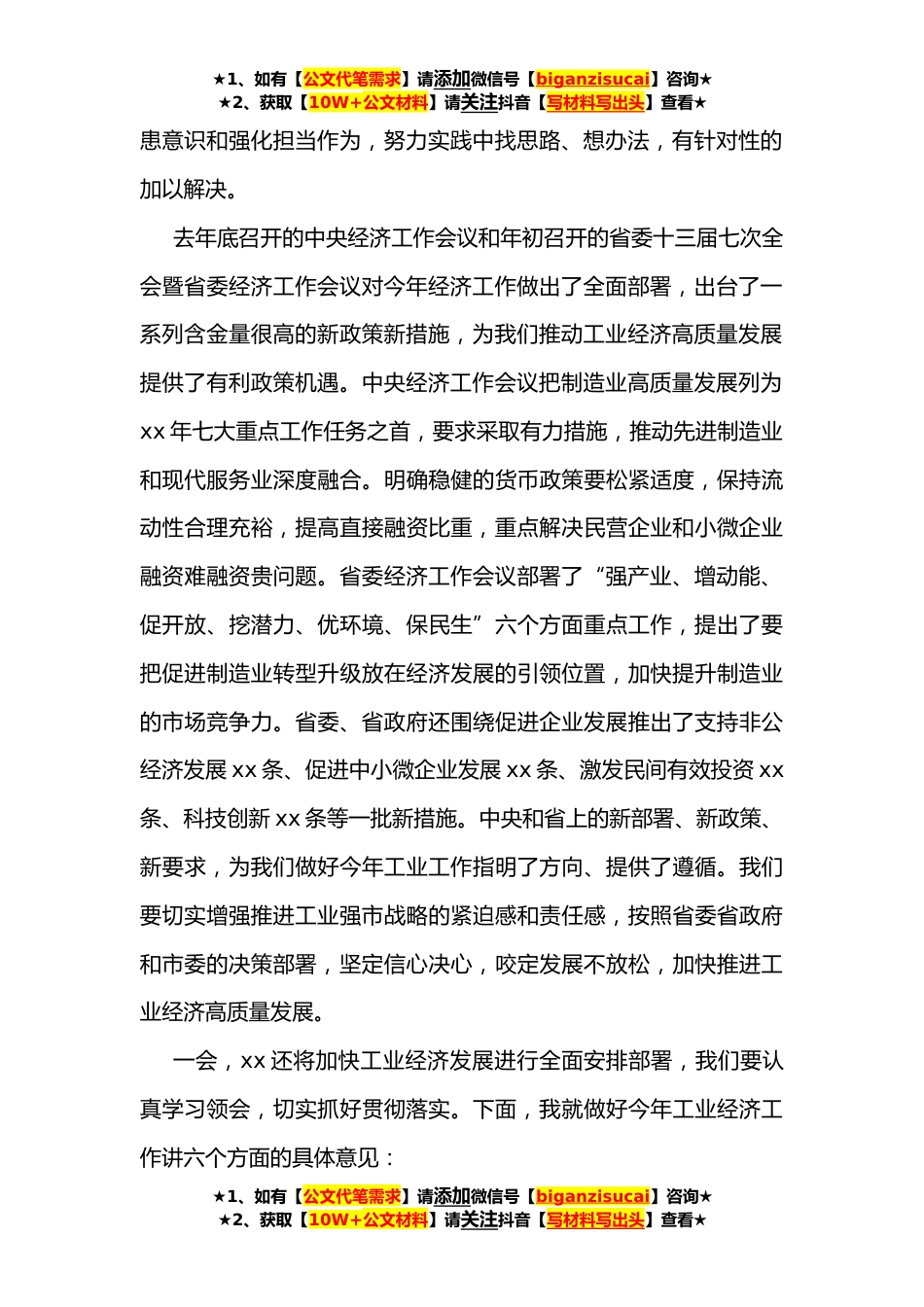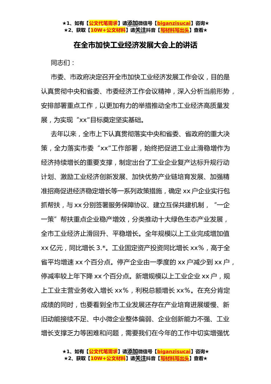 ★1、如有【公文代笔需求】请添加微信号【biganzisucai】咨询★★2、获取【10W+公文材料】请关注抖音【写材料写出头】查看★在全市加快工业经济发展大会上的讲话同志们:市委、市政府决定召开全市加快工业经济发展工作会议,目的是认真贯彻中央和省委、市委经济工作会议精神,深入分析当前形势,安排部署重点工作,以更加有力的举措推动全市工业经济高质量发展,为实现“xx”目标奠定坚实基础。去年以来,全市上下认真贯彻落实中央和省委、省政府的重大决策,全力落实市委“xx”工作部署,始终把促进工业止滑稳增作为经济持续增长的重要支撑,制定出台了工业企业复产达标升规行动计划、激励工业经济创新发展、加快优势产业链培育发展、加强精准招商促进经济稳定增长等一系列政策措施,确定xx户企业实行包抓帮扶,...