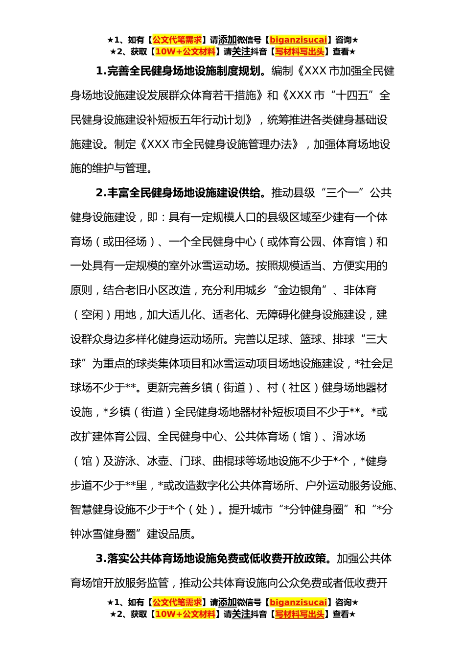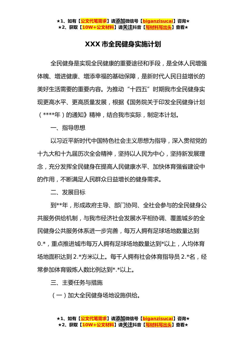 ★1、如有【公文代笔需求】请添加微信号【biganzisucai】咨询★★2、获取【10W+公文材料】请关注抖音【写材料写出头】查看★XXX市全民健身实施计划全民健身是实现全民健康的重要途径和手段,是全体人民增强体魄、增进健康、增添幸福的基础保障,是新时代人民日益增长的美好生活需要的重要内容。为推动“十四五”时期我市全民健身实现更高水平、更高质量发展,根据《国务院关于印发全民健身计划(****年)的通知》精神,结合我市实际,制定本计划。一、指导思想以习近平新时代中国特色社会主义思想为指导,深入贯彻党的十九大和十九届历次全会精神,坚持以人民为中心,坚持新发展理念,充分发挥全民健身在提高人民健康水平、加快体育强省建设中的作用,不断满足人民群众日益增长的健身需求。二、发展目标到**年,形...