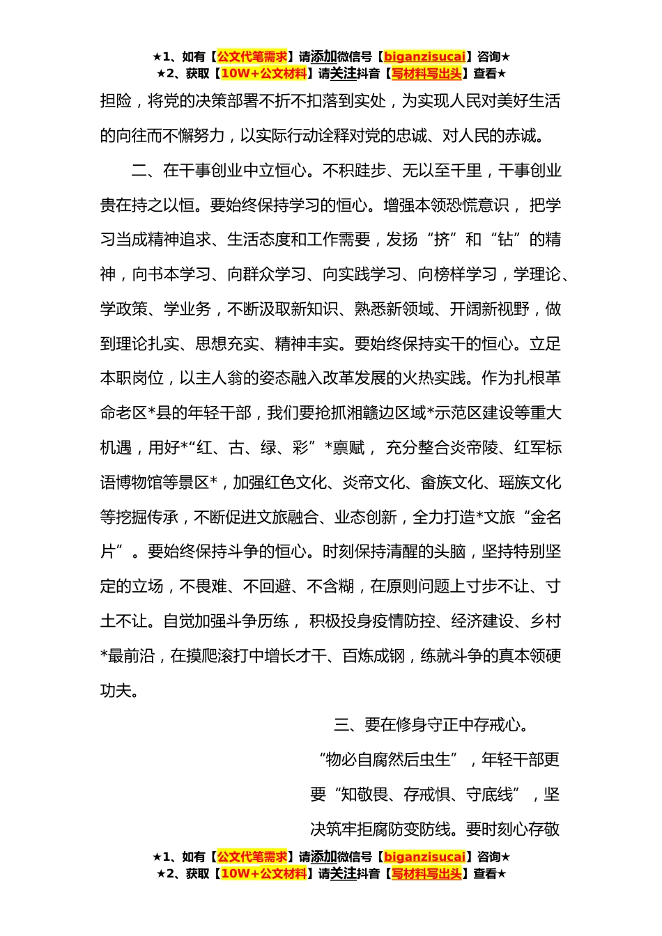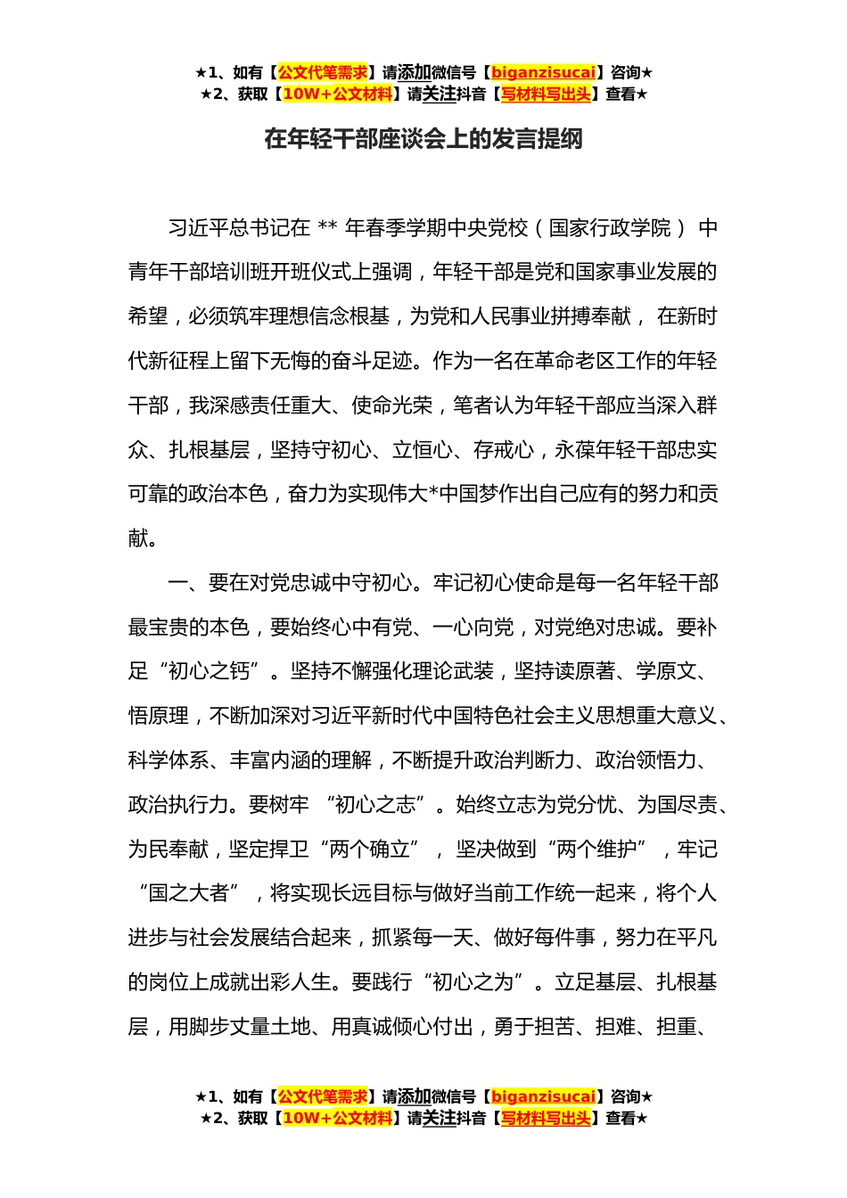 ★1、如有【公文代笔需求】请添加微信号【biganzisucai】咨询★★2、获取【10W+公文材料】请关注抖音【写材料写出头】查看★在年轻干部座谈会上的发言提纲习近平总书记在**年春季学期中央党校(国家行政学院)中青年干部培训班开班仪式上强调,年轻干部是党和国家事业发展的希望,必须筑牢理想信念根基,为党和人民事业拼搏奉献,在新时代新征程上留下无悔的奋斗足迹。作为一名在革命老区工作的年轻干部,我深感责任重大、使命光荣,笔者认为年轻干部应当深入群众、扎根基层,坚持守初心、立恒心、存戒心,永葆年轻干部忠实可靠的政治本色,奋力为实现伟大*中国梦作出自己应有的努力和贡献。一、要在对党忠诚中守初心。牢记初心使命是每一名年轻干部最宝贵的本色,要始终心中有党、一心向党,对党绝对忠诚。要补足...