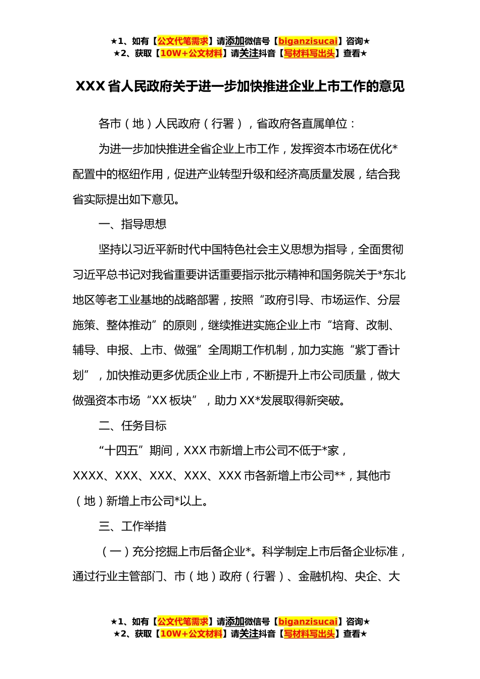 ★1、如有【公文代笔需求】请添加微信号【biganzisucai】咨询★★2、获取【10W+公文材料】请关注抖音【写材料写出头】查看★XXX省人民政府关于进一步加快推进企业上市工作的意见各市(地)人民政府(行署),省政府各直属单位:为进一步加快推进全省企业上市工作,发挥资本市场在优化*配置中的枢纽作用,促进产业转型升级和经济高质量发展,结合我省实际提出如下意见。一、指导思想坚持以习近平新时代中国特色社会主义思想为指导,全面贯彻习近平总书记对我省重要讲话重要指示批示精神和国务院关于*东北地区等老工业基地的战略部署,按照“政府引导、市场运作、分层施策、整体推动”的原则,继续推进实施企业上市“培育、改制、辅导、申报、上市、做强”全周期工作机制,加力实施“紫丁香计划”,加快推动更多优质...