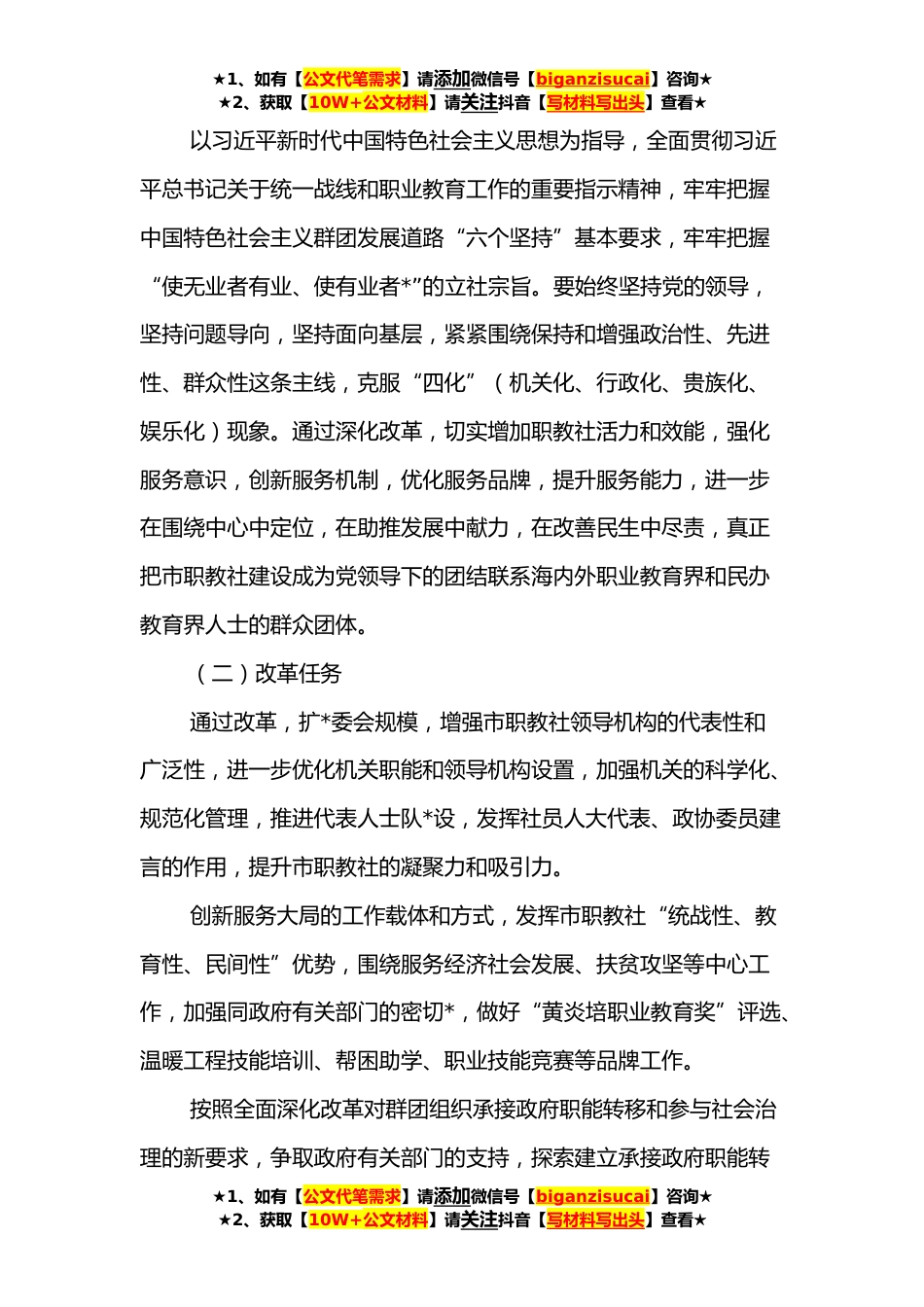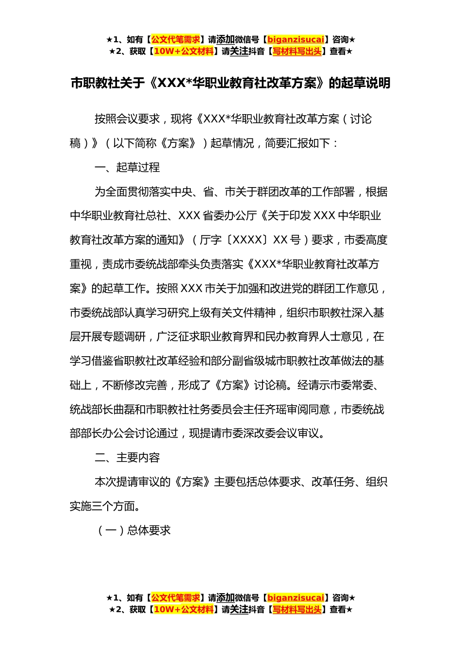 ★1、如有【公文代笔需求】请添加微信号【biganzisucai】咨询★★2、获取【10W+公文材料】请关注抖音【写材料写出头】查看★市职教社关于《XXX*华职业教育社改革方案》的起草说明按照会议要求,现将《XXX*华职业教育社改革方案(讨论稿)》(以下简称《方案》)起草情况,简要汇报如下:一、起草过程为全面贯彻落实中央、省、市关于群团改革的工作部署,根据中华职业教育社总社、XXX省委办公厅《关于印发XXX中华职业教育社改革方案的通知》(厅字〔XXXX〕XX号)要求,市委高度重视,责成市委统战部牵头负责落实《XXX*华职业教育社改革方案》的起草工作。按照XXX市关于加强和改进党的群团工作意见,市委统战部认真学习研究上级有关文件精神,组织市职教社深入基层开展专题调研,广泛征求职业教育界和民办教育界人士...