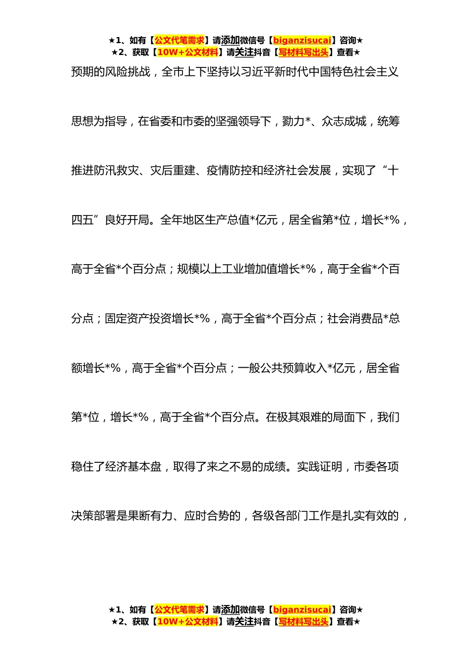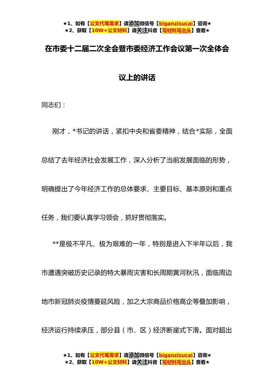 ★1、如有【公文代笔需求】请添加微信号【biganzisucai】咨询★★2、获取【10W+公文材料】请关注抖音【写材料写出头】查看★在市委十二届二次全会暨市委经济工作会议第一次全体会议上的讲话同志们:刚才,*书记的讲话,紧扣中央和省委精神,结合*实际,全面总结了去年经济社会发展工作,深入分析了当前发展面临的形势,明确提出了今年经济工作的总体要求、主要目标、基本原则和重点任务,我们要认真学习领会,抓好贯彻落实。**是极不平凡、极为艰难的一年,特别是进入下半年以后,我市遭遇突破历史记录的特大暴雨灾害和长周期黄河秋汛,面临周边地市新冠肺炎疫情蔓延风险,加之大宗商品价格高企等叠加影响,经济运行持续承压,部分县(市、区)经济断崖式下滑。面对超出★1、如有【公文代笔需求】请添加微信号【bi...