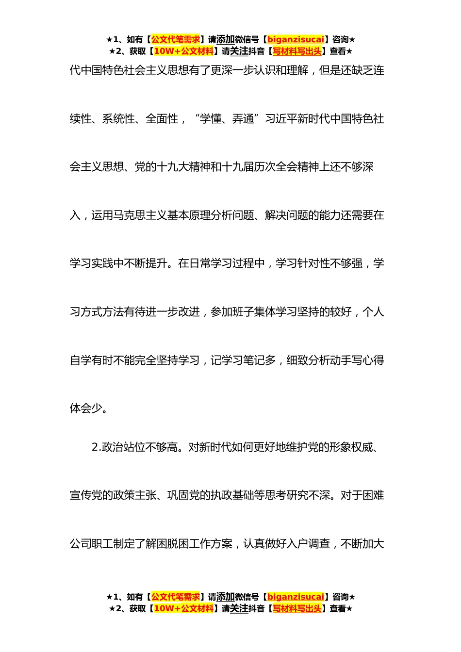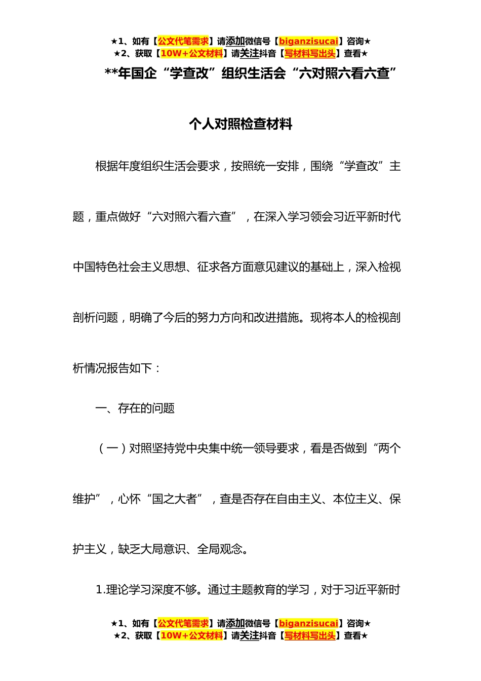 ★1、如有【公文代笔需求】请添加微信号【biganzisucai】咨询★★2、获取【10W+公文材料】请关注抖音【写材料写出头】查看★**年国企“学查改”组织生活会“六对照六看六查”个人对照检查材料根据年度组织生活会要求,按照统一安排,围绕“学查改”主题,重点做好“六对照六看六查”,在深入学习领会习近平新时代中国特色社会主义思想、征求各方面意见建议的基础上,深入检视剖析问题,明确了今后的努力方向和改进措施。现将本人的检视剖析情况报告如下:一、存在的问题(一)对照坚持党中央集中统一领导要求,看是否做到“两个维护”,心怀“国之大者”,查是否存在自由主义、本位主义、保护主义,缺乏大局意识、全局观念。1.理论学习深度不够。通过主题教育的学习,对于习近平新时★1、如有【公文代笔需求】请添...