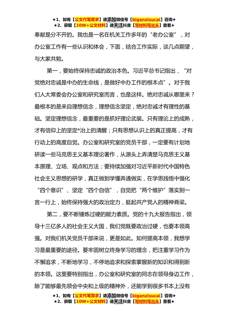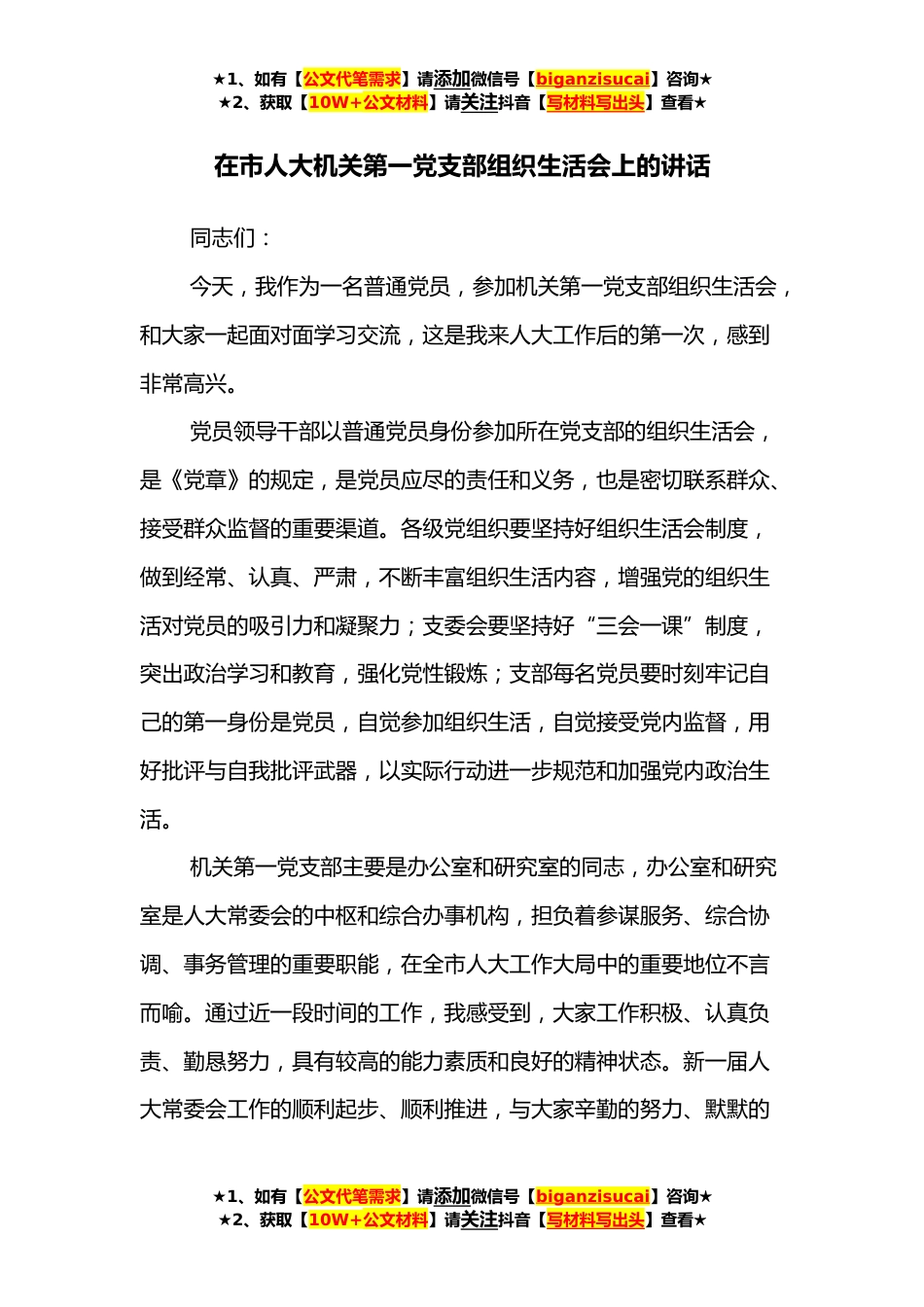 ★1、如有【公文代笔需求】请添加微信号【biganzisucai】咨询★★2、获取【10W+公文材料】请关注抖音【写材料写出头】查看★在市人大机关第一党支部组织生活会上的讲话同志们:今天,我作为一名普通党员,参加机关第一党支部组织生活会,和大家一起面对面学习交流,这是我来人大工作后的第一次,感到非常高兴。党员领导干部以普通党员身份参加所在党支部的组织生活会,是《党章》的规定,是党员应尽的责任和义务,也是密切联系群众、接受群众监督的重要渠道。各级党组织要坚持好组织生活会制度,做到经常、认真、严肃,不断丰富组织生活内容,增强党的组织生活对党员的吸引力和凝聚力;支委会要坚持好“三会一课”制度,突出政治学习和教育,强化党性锻炼;支部每名党员要时刻牢记自己的第一身份是党员,自觉参加...
