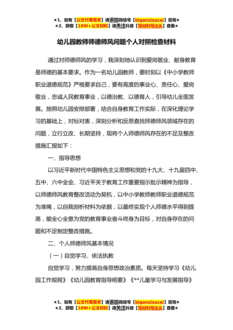 ★1、如有【公文代笔需求】请添加微信号【biganzisucai】咨询★★2、获取【10W+公文材料】请关注抖音【写材料写出头】查看★幼儿园教师师德师风问题个人对照检查材料通过对师德师风的学习,我深刻地认识到爱岗敬业、献身教育是师德的基本要求。作为一名幼儿园教师,要时刻以《中小学教师职业道德规范》严格要求自己,要有高度的事业心、责任心、爱岗敬业,忠诚人民教育事业,以德治教、以德育人,引导幼儿全面发展。按照幼儿园安排部署,结合自身教育工作实际,在深化理论学习的基础上,对标对表,深刻分析和反思查找师德师风领域存在的问题,立行立改、长期坚持,现将个人师德师风存在的不足及整改措施汇报如下:一、指导思想以习近平新时代中国特色主义思想和党的十九大、十九届四中、五中、六中全会、习近平关...