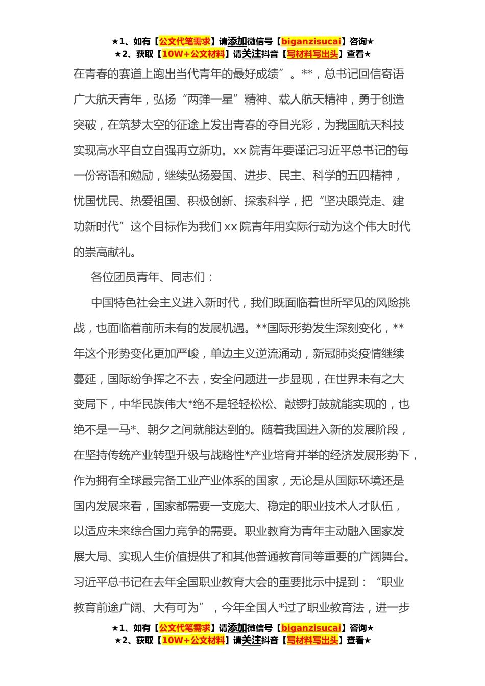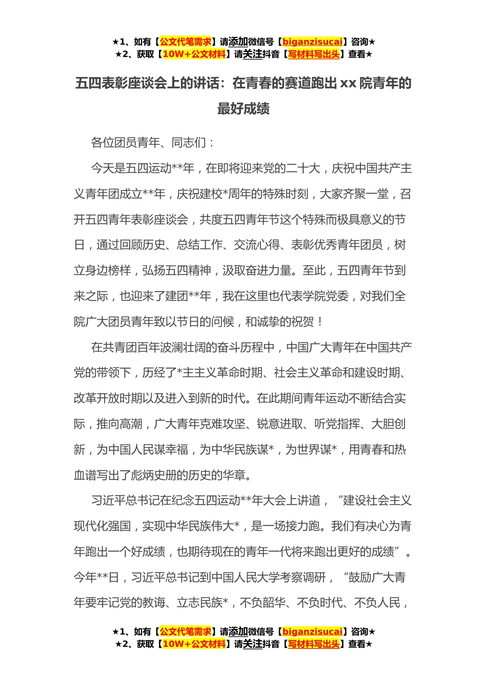 ★1、如有【公文代笔需求】请添加微信号【biganzisucai】咨询★★2、获取【10W+公文材料】请关注抖音【写材料写出头】查看★五四表彰座谈会上的讲话:在青春的赛道跑出xx院青年的最好成绩各位团员青年、同志们:今天是五四运动**年,在即将迎来党的二十大,庆祝中国共产主义青年团成立**年,庆祝建校*周年的特殊时刻,大家齐聚一堂,召开五四青年表彰座谈会,共度五四青年节这个特殊而极具意义的节日,通过回顾历史、总结工作、交流心得、表彰优秀青年团员,树立身边榜样,弘扬五四精神,汲取奋进力量。至此,五四青年节到来之际,也迎来了建团**年,我在这里也代表学院党委,对我们全院广大团员青年致以节日的问候,和诚挚的祝贺!在共青团百年波澜壮阔的奋斗历程中,中国广大青年在中国共产党的带领下,历经了*...