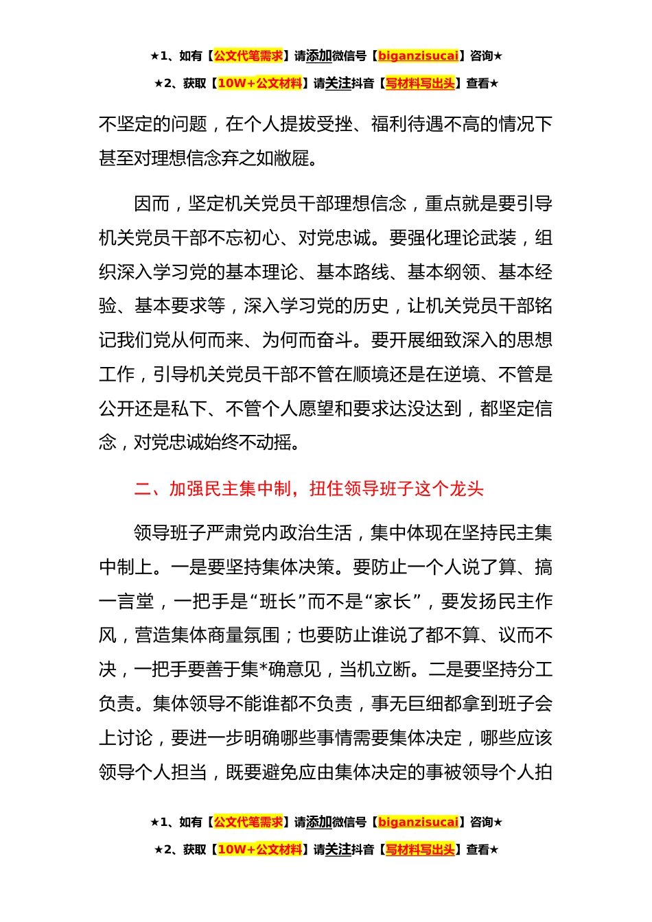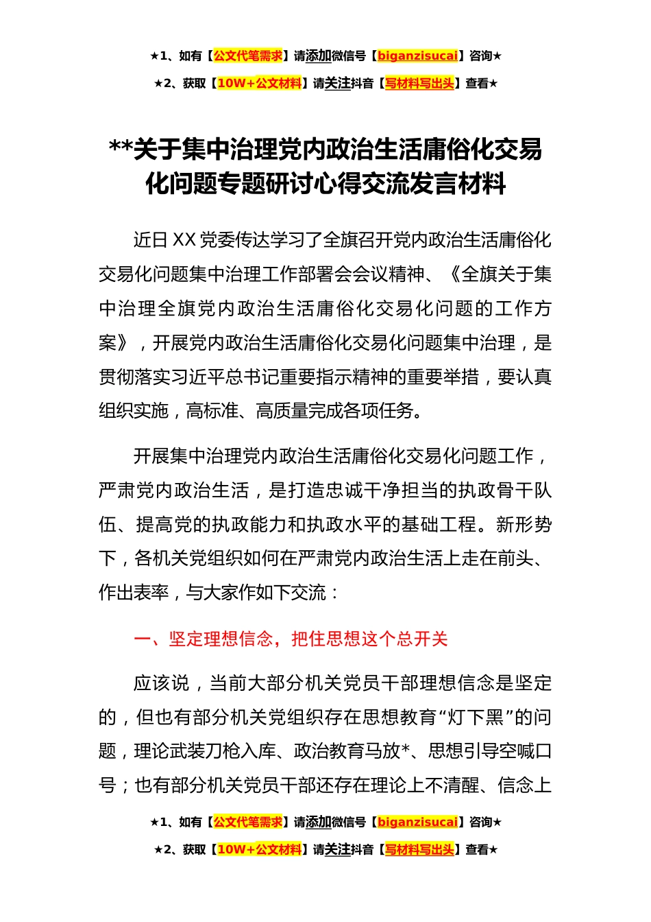 ★1、如有【公文代笔需求】请添加微信号【biganzisucai】咨询★★2、获取【10W+公文材料】请关注抖音【写材料写出头】查看★**关于集中治理党内政治生活庸俗化交易化问题专题研讨心得交流发言材料近日XX党委传达学习了全旗召开党内政治生活庸俗化交易化问题集中治理工作部署会会议精神、《全旗关于集中治理全旗党内政治生活庸俗化交易化问题的工作方案》,开展党内政治生活庸俗化交易化问题集中治理,是贯彻落实习近平总书记重要指示精神的重要举措,要认真组织实施,高标准、高质量完成各项任务。开展集中治理党内政治生活庸俗化交易化问题工作,严肃党内政治生活,是打造忠诚干净担当的执政骨干队伍、提高党的执政能力和执政水平的基础工程。新形势下,各机关党组织如何在严肃党内政治生活上走在前头、作出表率...