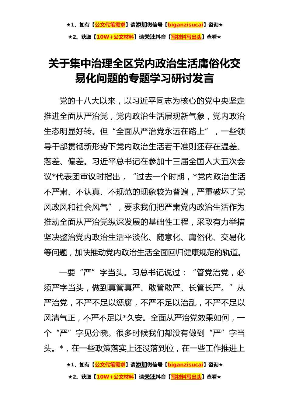 ★1、如有【公文代笔需求】请添加微信号【biganzisucai】咨询★★2、获取【10W+公文材料】请关注抖音【写材料写出头】查看★关于集中治理全区党内政治生活庸俗化交易化问题的专题学习研讨发言党的十八大以来,以习近平同志为核心的党中央坚定推进全面从严治党,党内政治生活展现新气象,党内政治生态明显好转。但“全面从严治党永远在路上”,一些领导干部贯彻新形势下党内政治生活若干准则还存在温差、落差、偏差。习近平总书记在参加十三届全国人大五次会议*代表团审议时指出,“过去一个时期,*党内政治生活不严肃、不认真、不规范的现象较为普遍,严重破坏了党风政风和社会风气”,要求我们把严肃党内政治生活作为推动全面从严治党纵深发展的基础性工程,采取有力举措坚决整治党内政治生活平淡化、随意化、庸...
