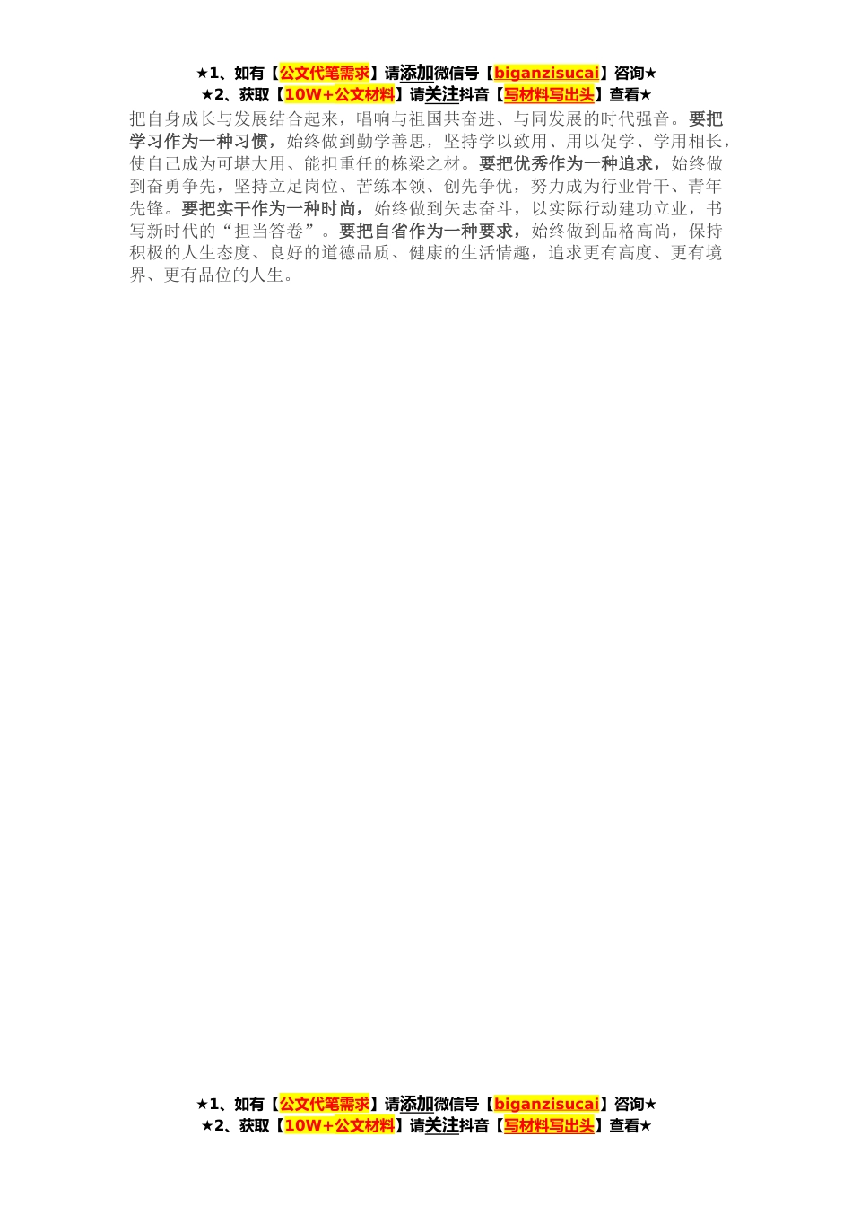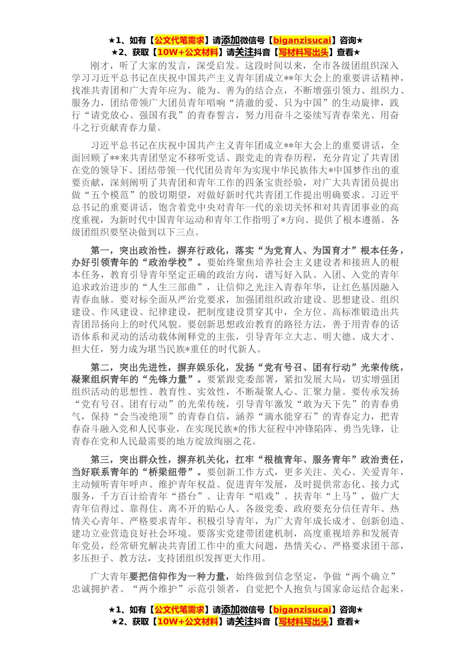 ★1、如有【公文代笔需求】请添加微信号【biganzisucai】咨询★★2、获取【10W+公文材料】请关注抖音【写材料写出头】查看★刚才,听了大家的发言,深受启发。这段时间以来,全市各级团组织深入学习习近平总书记在庆祝中国共产主义青年团成立**年大会上的重要讲话精神,找准共青团和广大青年应为、能为、善为的结合点,不断增强引领力、组织力、服务力,团结带领广大团员青年唱响“清澈的爱、只为中国”的生动旋律,践行“请党放心、强国有我”的青春誓言,努力用奋斗之姿续写青春荣光、用奋斗之行贡献青春力量。习近平总书记在庆祝中国共产主义青年团成立**年大会上的重要讲话,全面回顾了**来共青团坚定不移听党话、跟党走的青春历程,充分肯定了共青团在党的领导下、团结带领一代代团员青年为实现中华民族伟大*...