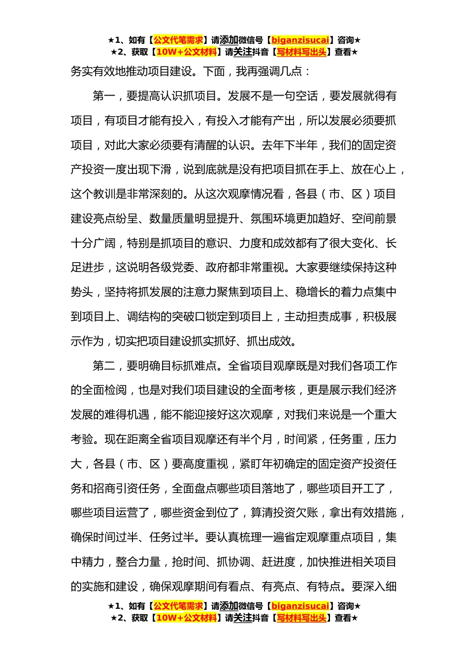★1、如有【公文代笔需求】请添加微信号【biganzisucai】咨询★★2、获取【10W+公文材料】请关注抖音【写材料写出头】查看★在全市项目观摩点评会议上的讲话同志们:刚才,**个县(市、区)围绕项目建设和招商引资工作进行了汇报,**同志通报了全市和各县(市、区)项目建设和招商引资情况,**同志对各县(市、区)项目建设及观摩情况进行了点评,**市长就如何抓项目落地、跟踪服务、招商引资提出了明确要求。整体上看,观摩很务实,问题很具体,通报很实际,点评很中肯,安排部署扎实到位,我完全赞成和同意,大家回去要认真抓好贯彻落实。市委、市政府决定开展全市项目观摩,目的就是通过相互学习、相互借鉴,进一步帮助大家开阔视野、取长补短,共同推动全市项目建设各项目标任务落实,促进经济社会持续健康发...