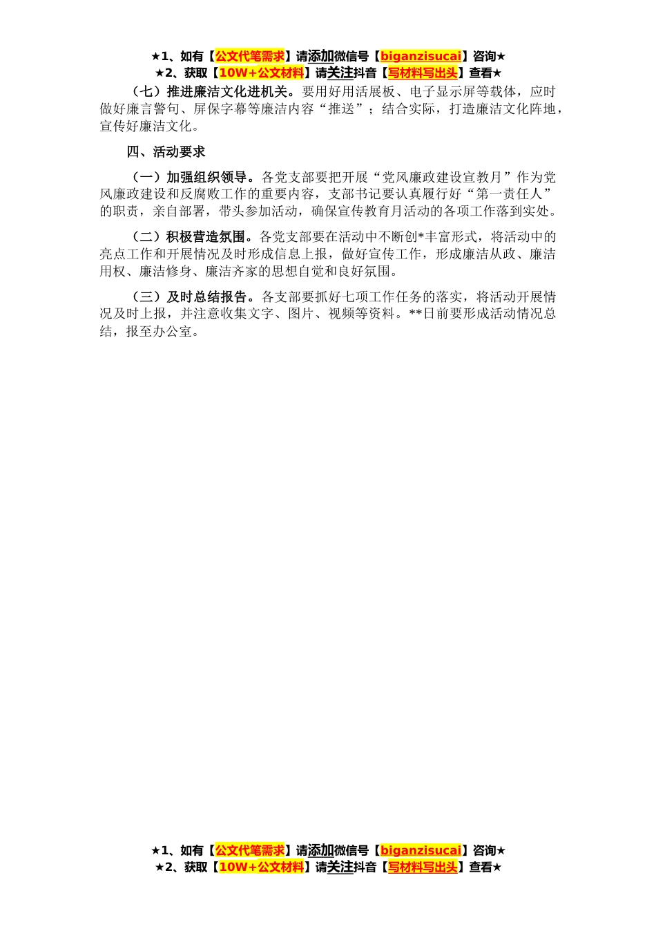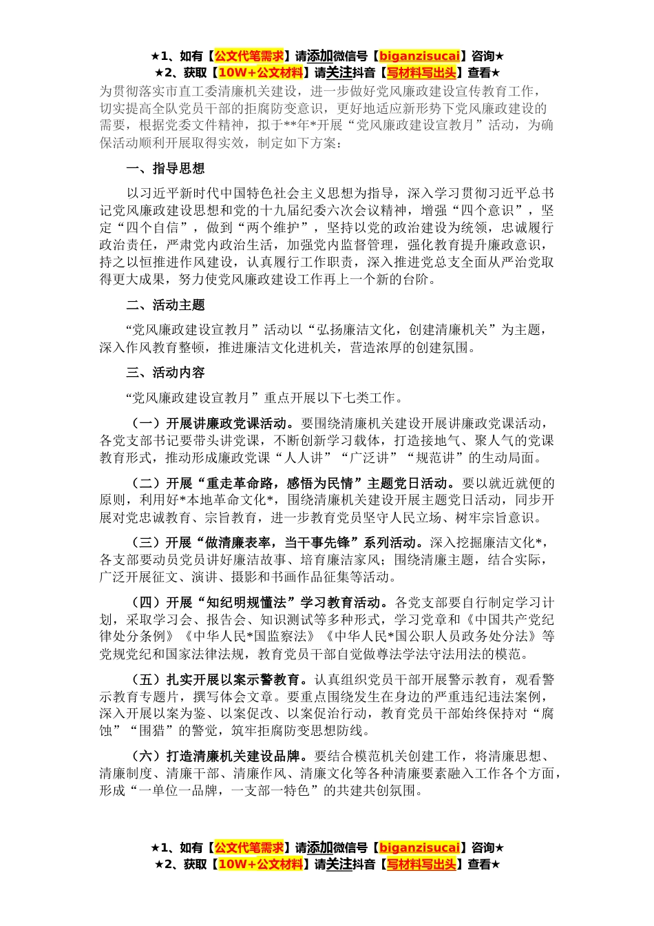 ★1、如有【公文代笔需求】请添加微信号【biganzisucai】咨询★★2、获取【10W+公文材料】请关注抖音【写材料写出头】查看★为贯彻落实市直工委清廉机关建设,进一步做好党风廉政建设宣传教育工作,切实提高全队党员干部的拒腐防变意识,更好地适应新形势下党风廉政建设的需要,根据党委文件精神,拟于**年*开展“党风廉政建设宣教月”活动,为确保活动顺利开展取得实效,制定如下方案:一、指导思想以习近平新时代中国特色社会主义思想为指导,深入学习贯彻习近平总书记党风廉政建设思想和党的十九届纪委六次会议精神,增强“四个意识”,坚定“四个自信”,做到“两个维护”,坚持以党的政治建设为统领,忠诚履行政治责任,严肃党内政治生活,加强党内监督管理,强化教育提升廉政意识,持之以恒推进作风建设,认...
