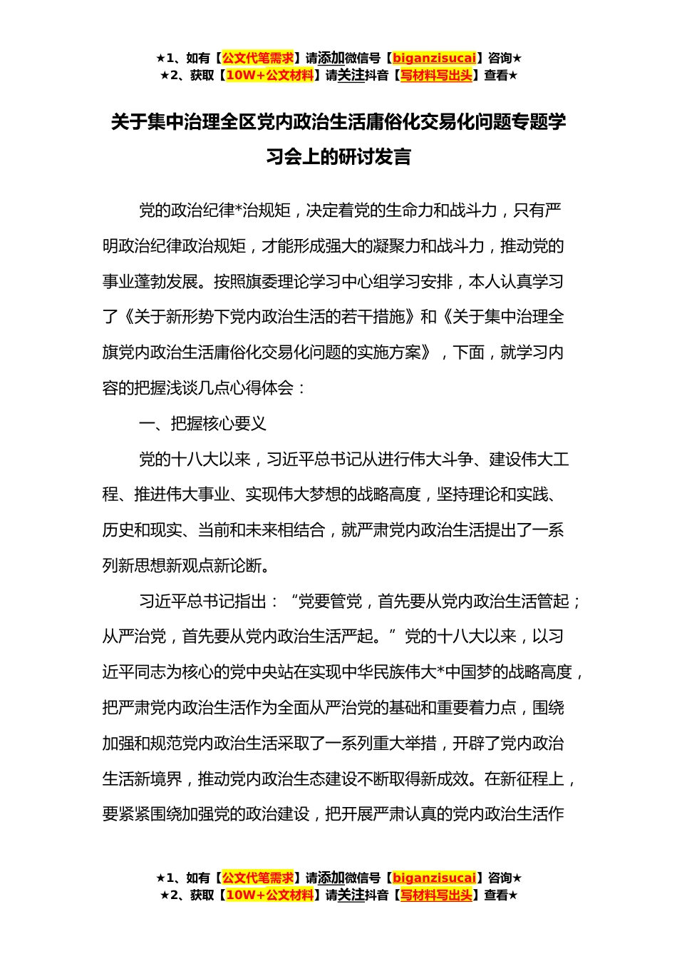 ★1、如有【公文代笔需求】请添加微信号【biganzisucai】咨询★★2、获取【10W+公文材料】请关注抖音【写材料写出头】查看★关于集中治理全区党内政治生活庸俗化交易化问题专题学习会上的研讨发言党的政治纪律*治规矩,决定着党的生命力和战斗力,只有严明政治纪律政治规矩,才能形成强大的凝聚力和战斗力,推动党的事业蓬勃发展。按照旗委理论学习中心组学习安排,本人认真学习了《关于新形势下党内政治生活的若干措施》和《关于集中治理全旗党内政治生活庸俗化交易化问题的实施方案》,下面,就学习内容的把握浅谈几点心得体会:一、把握核心要义党的十八大以来,习近平总书记从进行伟大斗争、建设伟大工程、推进伟大事业、实现伟大梦想的战略高度,坚持理论和实践、历史和现实、当前和未来相结合,就严肃党内政...