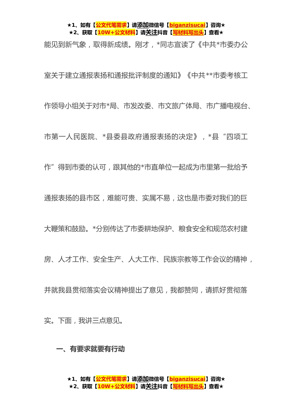 ★1、如有【公文代笔需求】请添加微信号【biganzisucai】咨询★★2、获取【10W+公文材料】请关注抖音【写材料写出头】查看★书记在全县县级领导干部会议上的讲话同志们:阳和启蛰,品物皆春。在全县上下众志成城战疫情,全力冲刺“一季度”的关键节点,我们召开这次全县县级领导干部会议,主要有三个目的:一是传达精神。按照市委“**工作法,传达市委有关工作会议精神,研究*贯彻落实意见。二是传导信号。近期市委释放出了一切围绕“干”,真干、实干的鲜明态度和强烈信号,大家要把思想和认识统一到市委的工作导向中来,切实增强等不起、慢不得、坐不住的紧迫感和责任感。三是传递信心。这些天大家奋战在疫情防控、安全生产、森林防火等当前重点工作一线,取得了一些成绩,要把这个劲头保持下来,继续加压奋进,...