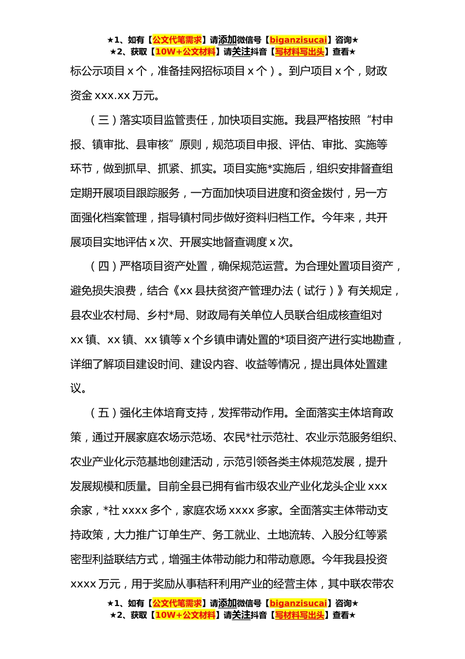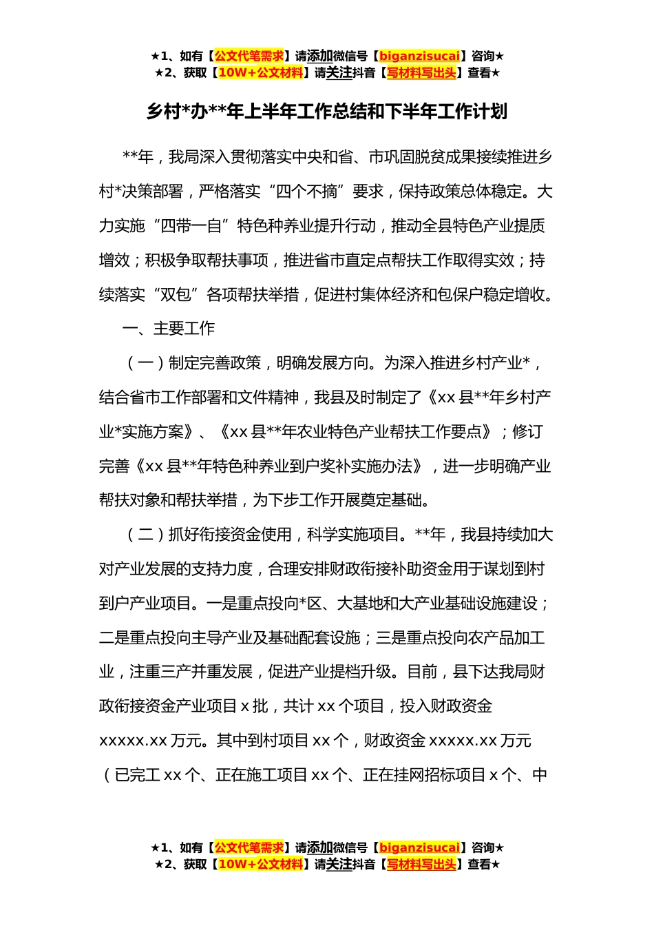 ★1、如有【公文代笔需求】请添加微信号【biganzisucai】咨询★★2、获取【10W+公文材料】请关注抖音【写材料写出头】查看★乡村*办**年上半年工作总结和下半年工作计划**年,我局深入贯彻落实中央和省、市巩固脱贫成果接续推进乡村*决策部署,严格落实“四个不摘”要求,保持政策总体稳定。大力实施“四带一自”特色种养业提升行动,推动全县特色产业提质增效;积极争取帮扶事项,推进省市直定点帮扶工作取得实效;持续落实“双包”各项帮扶举措,促进村集体经济和包保户稳定增收。一、主要工作(一)制定完善政策,明确发展方向。为深入推进乡村产业*,结合省市工作部署和文件精神,我县及时制定了《xx县**年乡村产业*实施方案》、《xx县**年农业特色产业帮扶工作要点》;修订完善《xx县**年特色种养业到户奖补...