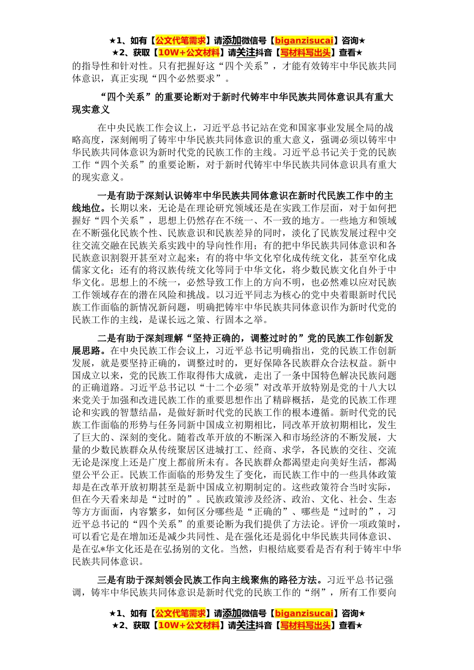 ★1、如有【公文代笔需求】请添加微信号【biganzisucai】咨询★★2、获取【10W+公文材料】请关注抖音【写材料写出头】查看★习近平总书记在中央民族工作会议上提出,做好民族工作必须正确把握共同性和差异性的关系、中华民族共同体意识和各民族意识的关系、中华文化和各民族文化的关系、物质和精神的关系,并对各个关系中矛盾的主要方面和次要方面、解决矛盾的目标和方法进行了深刻的阐述。习近平总书记关于党的民族工作必须正确把握“四个关系”的重要论断,是马克思主义民族理论中国化的最新成果,我们必须认真学习研究和把握其精神实质。“四个关系”的重要论断是马克思主义民族理论与中国实践相结合的最新成果民族问题是社会发展总问题的一部分。社会在发展变化,民族问题也随之变化。在不同的历史时期和社会...