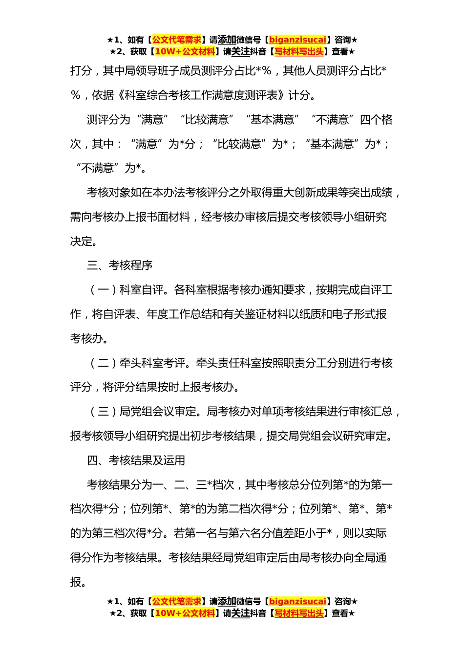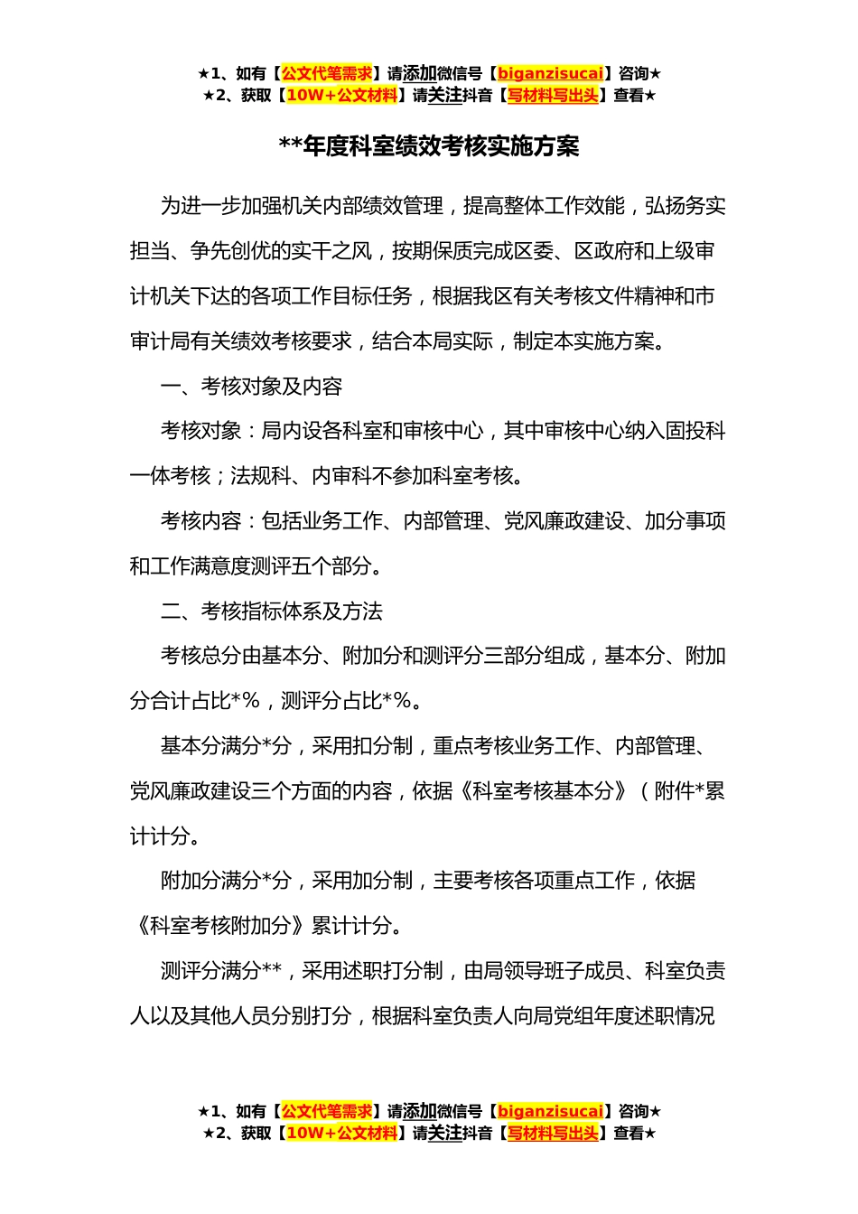 ★1、如有【公文代笔需求】请添加微信号【biganzisucai】咨询★★2、获取【10W+公文材料】请关注抖音【写材料写出头】查看★**年度科室绩效考核实施方案为进一步加强机关内部绩效管理,提高整体工作效能,弘扬务实担当、争先创优的实干之风,按期保质完成区委、区政府和上级审计机关下达的各项工作目标任务,根据我区有关考核文件精神和市审计局有关绩效考核要求,结合本局实际,制定本实施方案。一、考核对象及内容考核对象:局内设各科室和审核中心,其中审核中心纳入固投科一体考核;法规科、内审科不参加科室考核。考核内容:包括业务工作、内部管理、党风廉政建设、加分事项和工作满意度测评五个部分。二、考核指标体系及方法考核总分由基本分、附加分和测评分三部分组成,基本分、附加分合计占比*%,测评分...