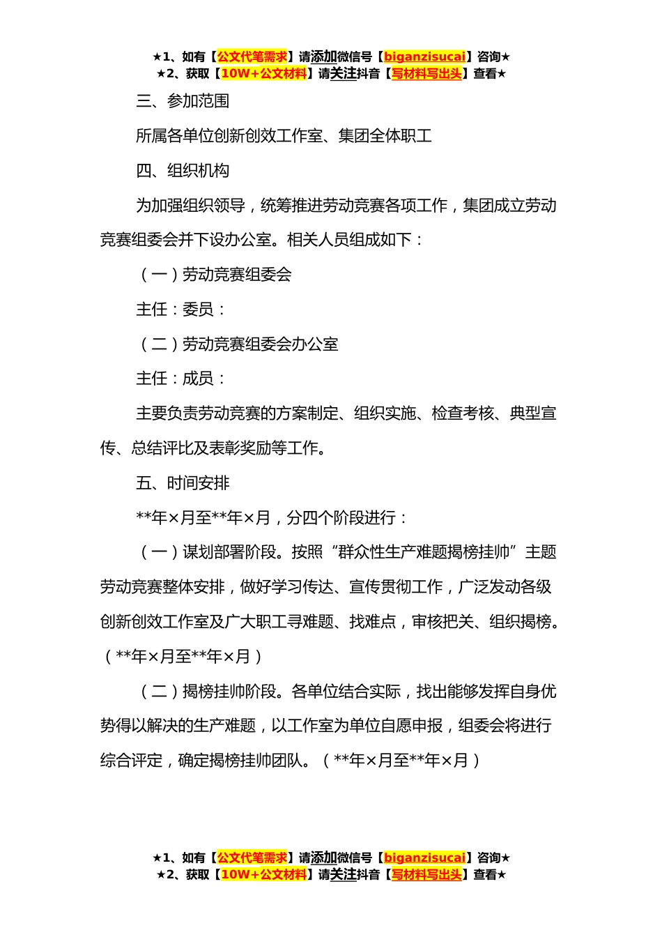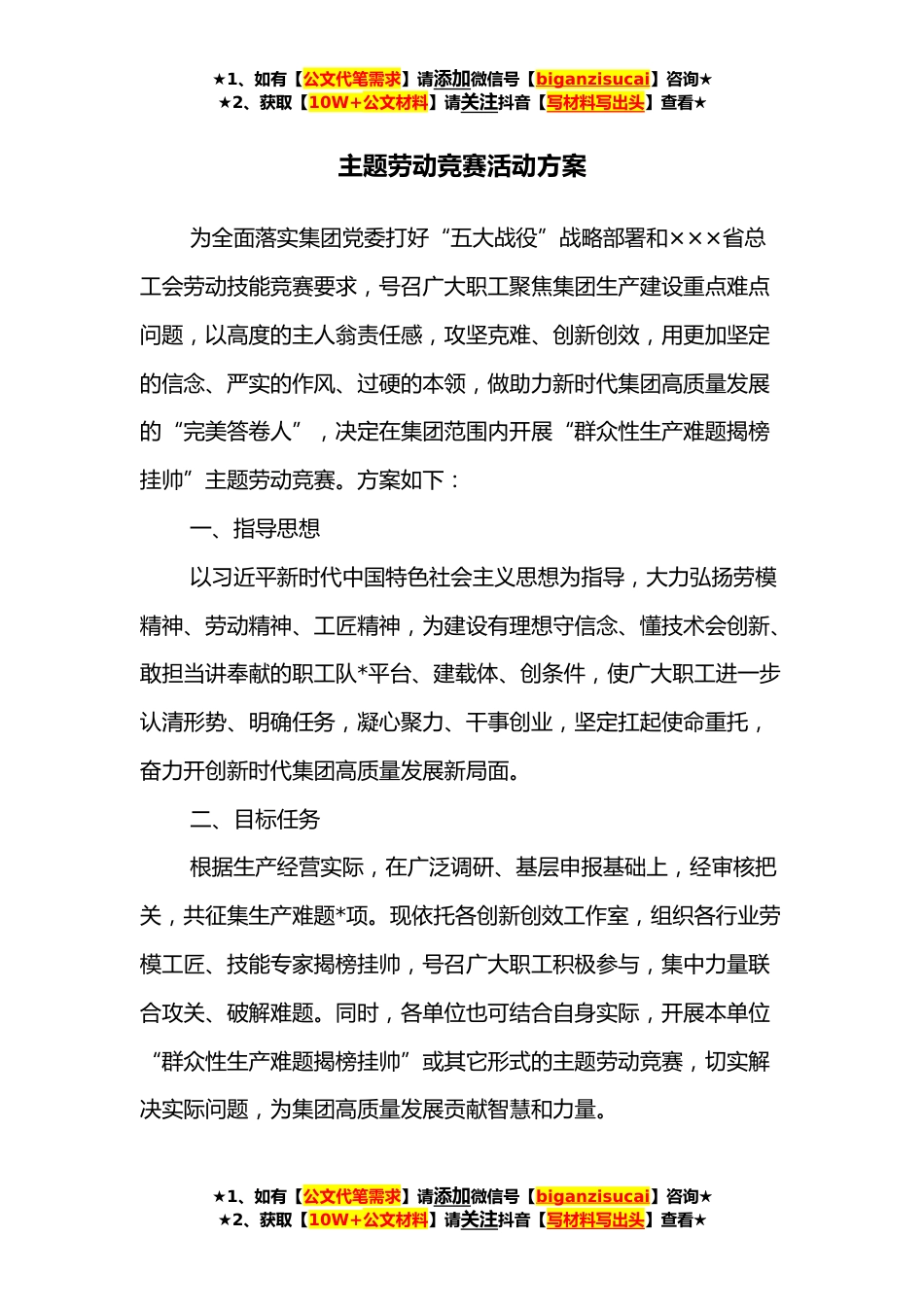 ★1、如有【公文代笔需求】请添加微信号【biganzisucai】咨询★★2、获取【10W+公文材料】请关注抖音【写材料写出头】查看★主题劳动竞赛活动方案为全面落实集团党委打好“五大战役”战略部署和×××省总工会劳动技能竞赛要求,号召广大职工聚焦集团生产建设重点难点问题,以高度的主人翁责任感,攻坚克难、创新创效,用更加坚定的信念、严实的作风、过硬的本领,做助力新时代集团高质量发展的“完美答卷人”,决定在集团范围内开展“群众性生产难题揭榜挂帅”主题劳动竞赛。方案如下:一、指导思想以习近平新时代中国特色社会主义思想为指导,大力弘扬劳模精神、劳动精神、工匠精神,为建设有理想守信念、懂技术会创新、敢担当讲奉献的职工队*平台、建载体、创条件,使广大职工进一步认清形势、明确任务,凝心聚...