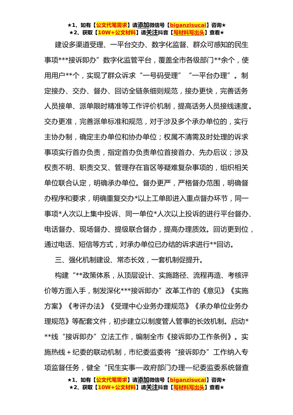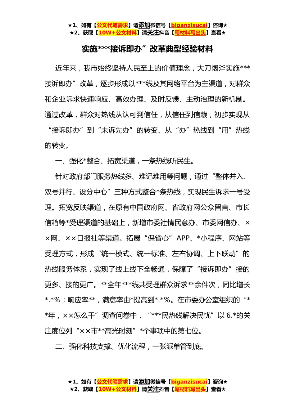 ★1、如有【公文代笔需求】请添加微信号【biganzisucai】咨询★★2、获取【10W+公文材料】请关注抖音【写材料写出头】查看★实施***接诉即办”改革典型经验材料近年来,我市始终坚持人民至上的价值理念,大刀阔斧实施***接诉即办”改革,逐步形成以***线及其网络平台为主渠道,对群众和企业诉求快速响应、高效办理、及时反馈、主动治理的新机制。通过改革,群众对热线从认可到信任,从信任到信赖,初步实现从“接诉即办”到“未诉先办”的转变、从“办”热线到“用”热线的转变。一、强化*整合、拓宽渠道,一条热线听民生。针对政府部门服务热线多、难记难用等问题,通过“整体并入、双号并行、设分中心”三种方式整合*条热线,实现民生诉求一号受理。拓宽反映渠道,在原有中国政府网、省政府网公众留言、市长信箱...