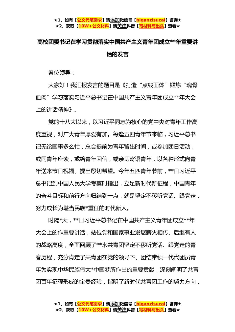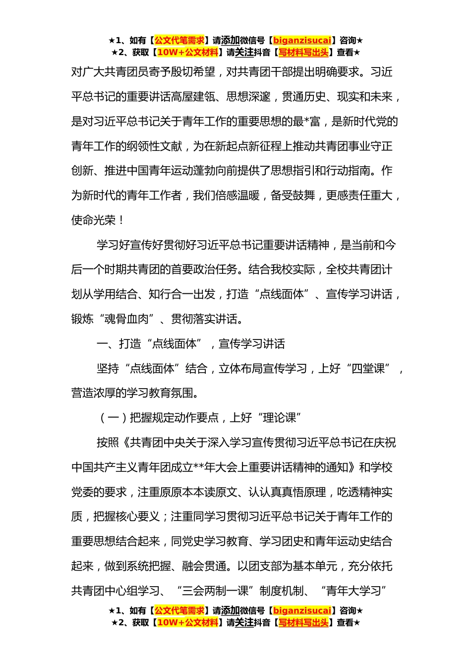 ★1、如有【公文代笔需求】请添加微信号【biganzisucai】咨询★★2、获取【10W+公文材料】请关注抖音【写材料写出头】查看★高校团委书记在学习贯彻落实中国共产主义青年团成立**年重要讲话的发言各位领导:大家好!我汇报发言的题目是《打造“点线面体”锻炼“魂骨血肉”学习落实习近平总书记在中国共产主义青年团成立**年大会上的讲话精神》。党的十八大以来,以习近平同志为核心的党中央对青年工作高度重视,对广大青年厚爱有加。每逢五四青年节来临,习近平总书记无论国事多么忙,总会提前为青年留出时间,或参加团日活动,或同青年座谈,或给青年回信,或亲切寄语青年,以各种形式向青年送来节日祝福、提出殷切希望。今年五四青年节前,**日习近平总书记到中国人民大学考察时指出,立足新时代新征程,中国青...