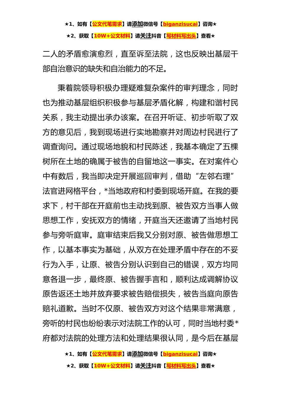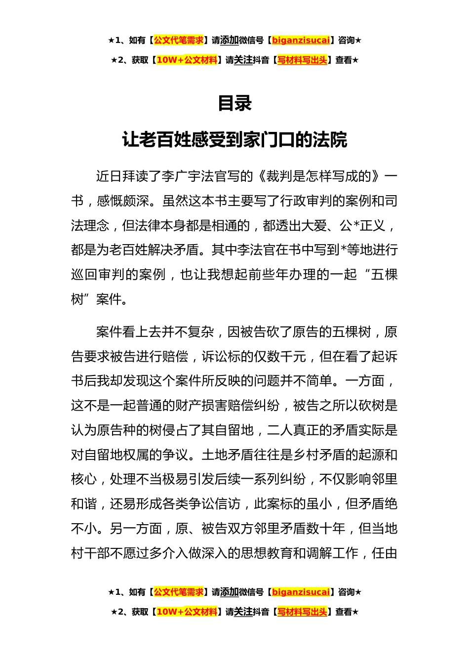 ★1、如有【公文代笔需求】请添加微信号【biganzisucai】咨询★★2、获取【10W+公文材料】请关注抖音【写材料写出头】查看★目录让老百姓感受到家门口的法院近日拜读了李广宇法官写的《裁判是怎样写成的》一书,感慨颇深。虽然这本书主要写了行政审判的案例和司法理念,但法律本身都是相通的,都透出大爱、公*正义,都是为老百姓解决矛盾。其中李法官在书中写到*等地进行巡回审判的案例,也让我想起前些年办理的一起“五棵树”案件。案件看上去并不复杂,因被告砍了原告的五棵树,原告要求被告进行赔偿,诉讼标的仅数千元,但在看了起诉书后我却发现这个案件所反映的问题并不简单。一方面,这不是一起普通的财产损害赔偿纠纷,被告之所以砍树是认为原告种的树侵占了其自留地,二人真正的矛盾实际是对自留地权属的...