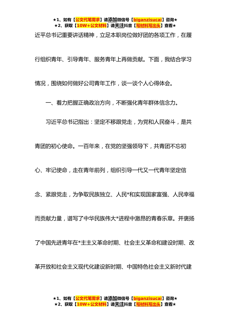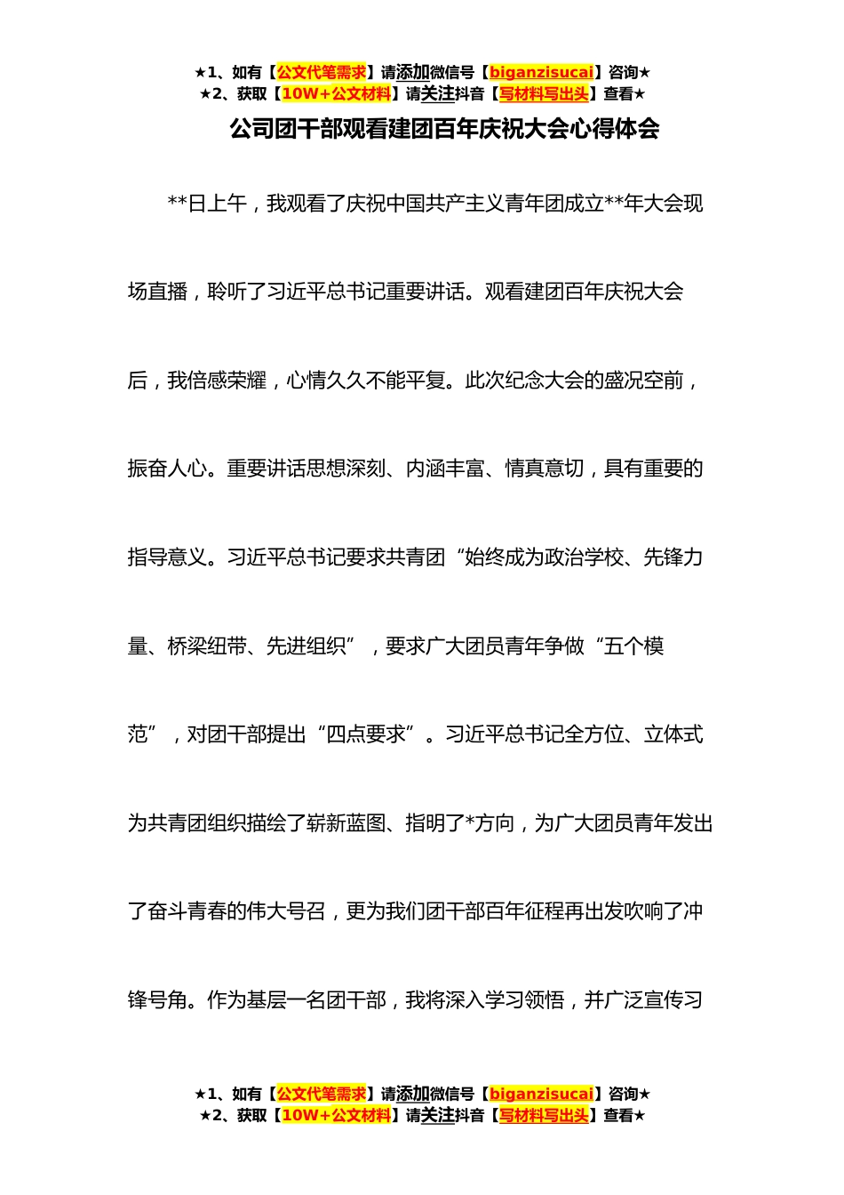 ★1、如有【公文代笔需求】请添加微信号【biganzisucai】咨询★★2、获取【10W+公文材料】请关注抖音【写材料写出头】查看★公司团干部观看建团百年庆祝大会心得体会**日上午,我观看了庆祝中国共产主义青年团成立**年大会现场直播,聆听了习近平总书记重要讲话。观看建团百年庆祝大会后,我倍感荣耀,心情久久不能平复。此次纪念大会的盛况空前,振奋人心。重要讲话思想深刻、内涵丰富、情真意切,具有重要的指导意义。习近平总书记要求共青团“始终成为政治学校、先锋力量、桥梁纽带、先进组织”,要求广大团员青年争做“五个模范”,对团干部提出“四点要求”。习近平总书记全方位、立体式为共青团组织描绘了崭新蓝图、指明了*方向,为广大团员青年发出了奋斗青春的伟大号召,更为我们团干部百年征程再出发吹响...