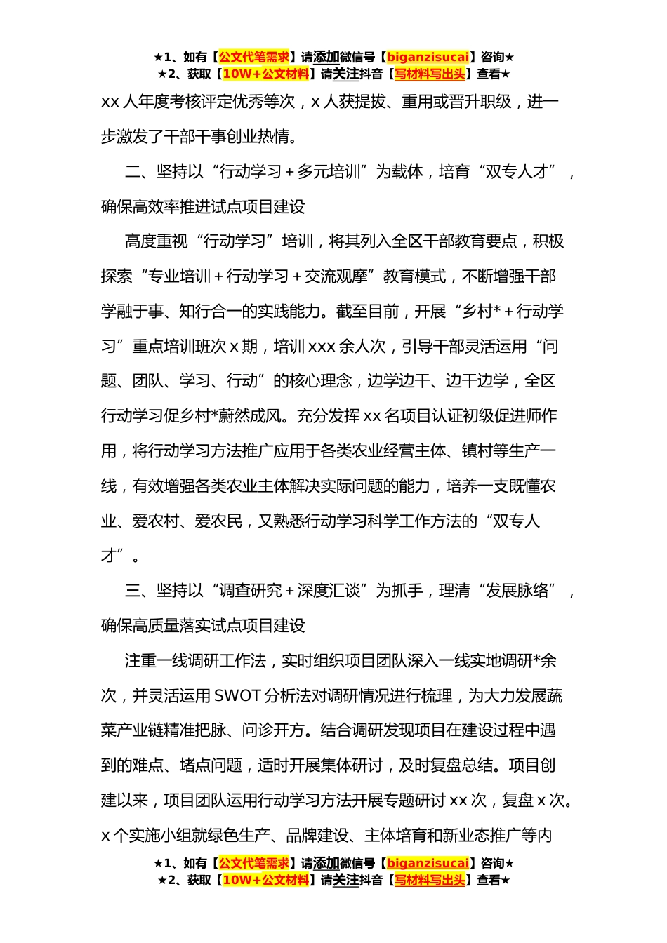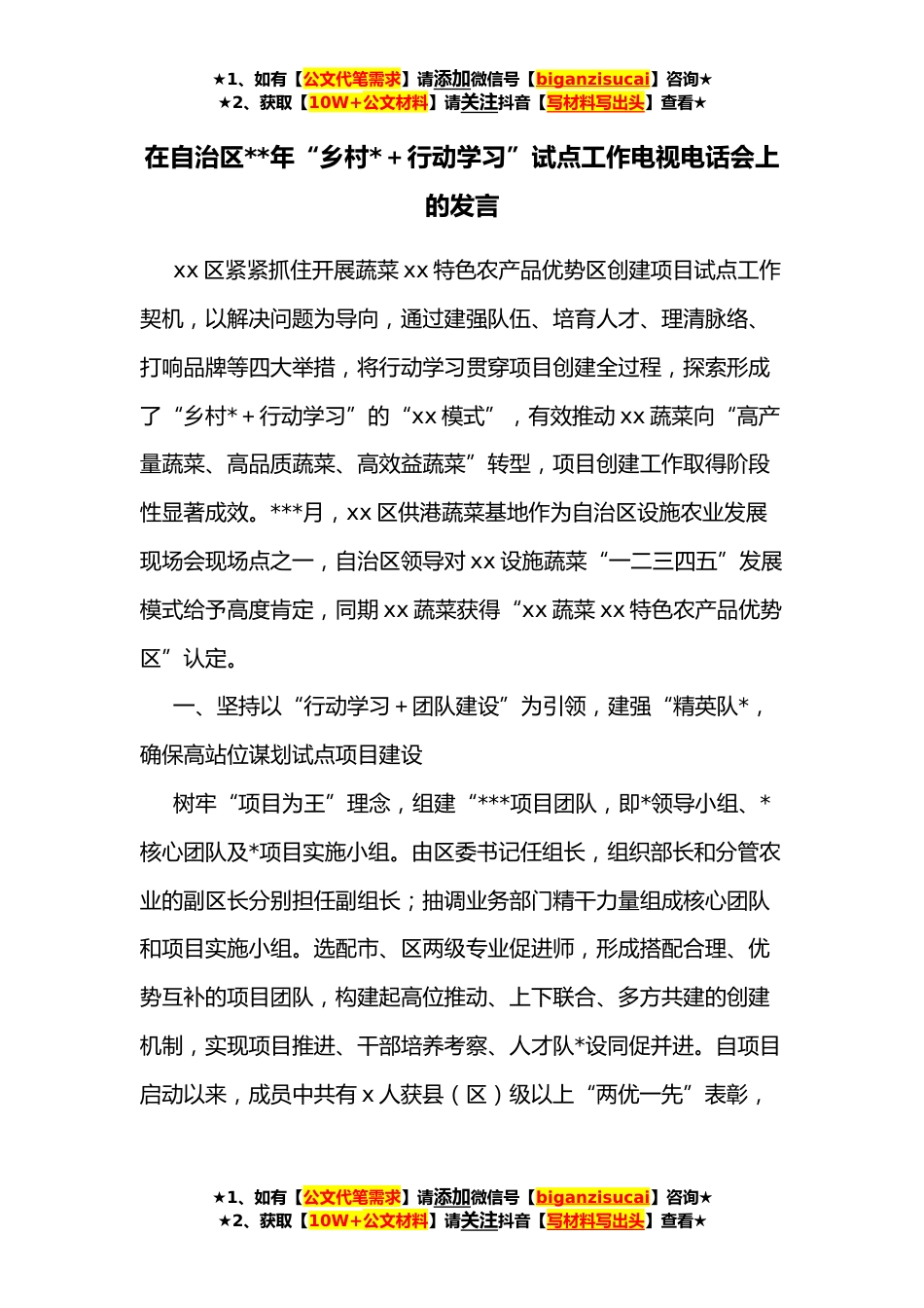 ★1、如有【公文代笔需求】请添加微信号【biganzisucai】咨询★★2、获取【10W+公文材料】请关注抖音【写材料写出头】查看★在自治区**年“乡村*+行动学习”试点工作电视电话会上的发言xx区紧紧抓住开展蔬菜xx特色农产品优势区创建项目试点工作契机,以解决问题为导向,通过建强队伍、培育人才、理清脉络、打响品牌等四大举措,将行动学习贯穿项目创建全过程,探索形成了“乡村*+行动学习”的“xx模式”,有效推动xx蔬菜向“高产量蔬菜、高品质蔬菜、高效益蔬菜”转型,项目创建工作取得阶段性显著成效。***月,xx区供港蔬菜基地作为自治区设施农业发展现场会现场点之一,自治区领导对xx设施蔬菜“一二三四五”发展模式给予高度肯定,同期xx蔬菜获得“xx蔬菜xx特色农产品优势区”认定。一、坚持以“行动学习+团...