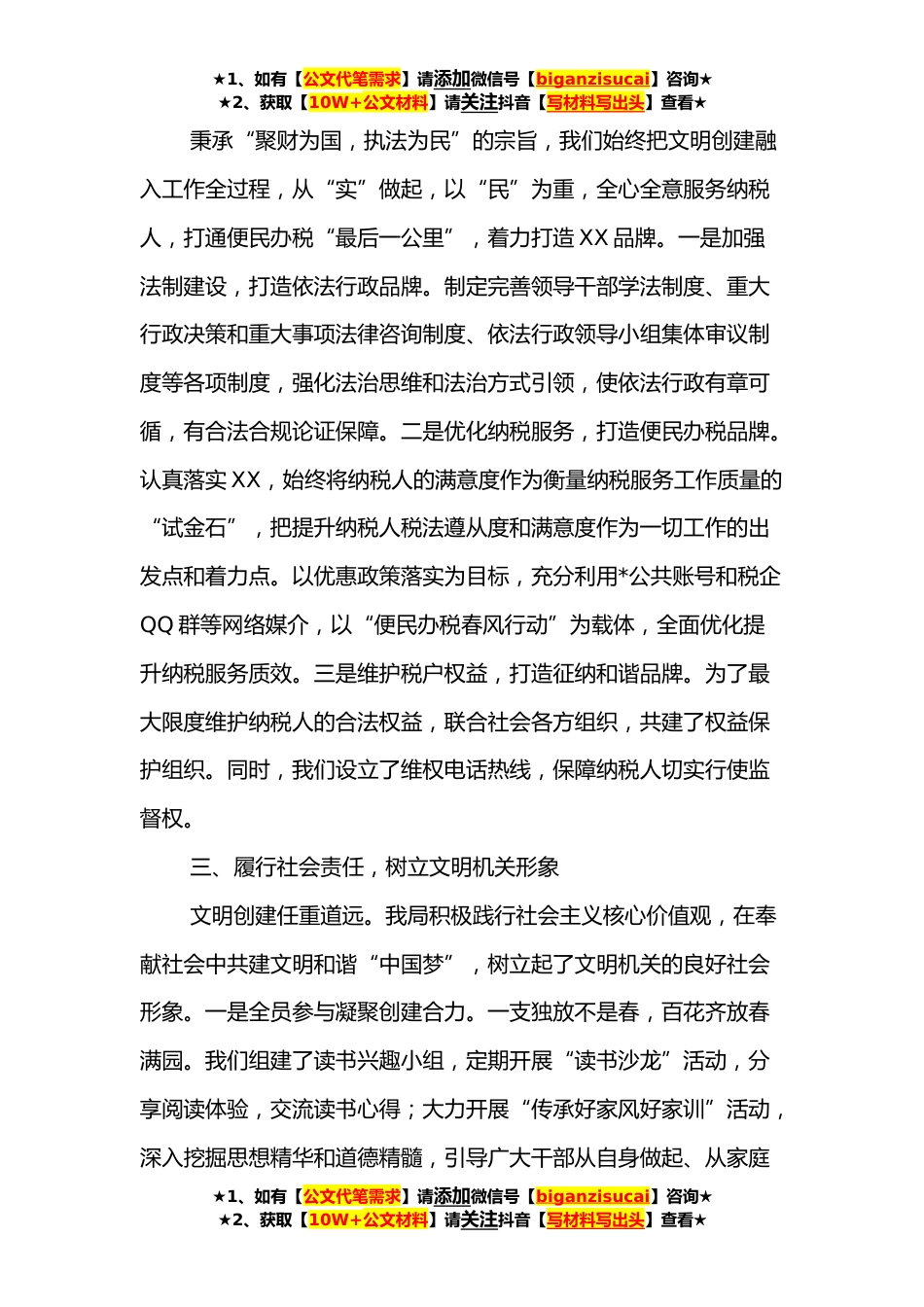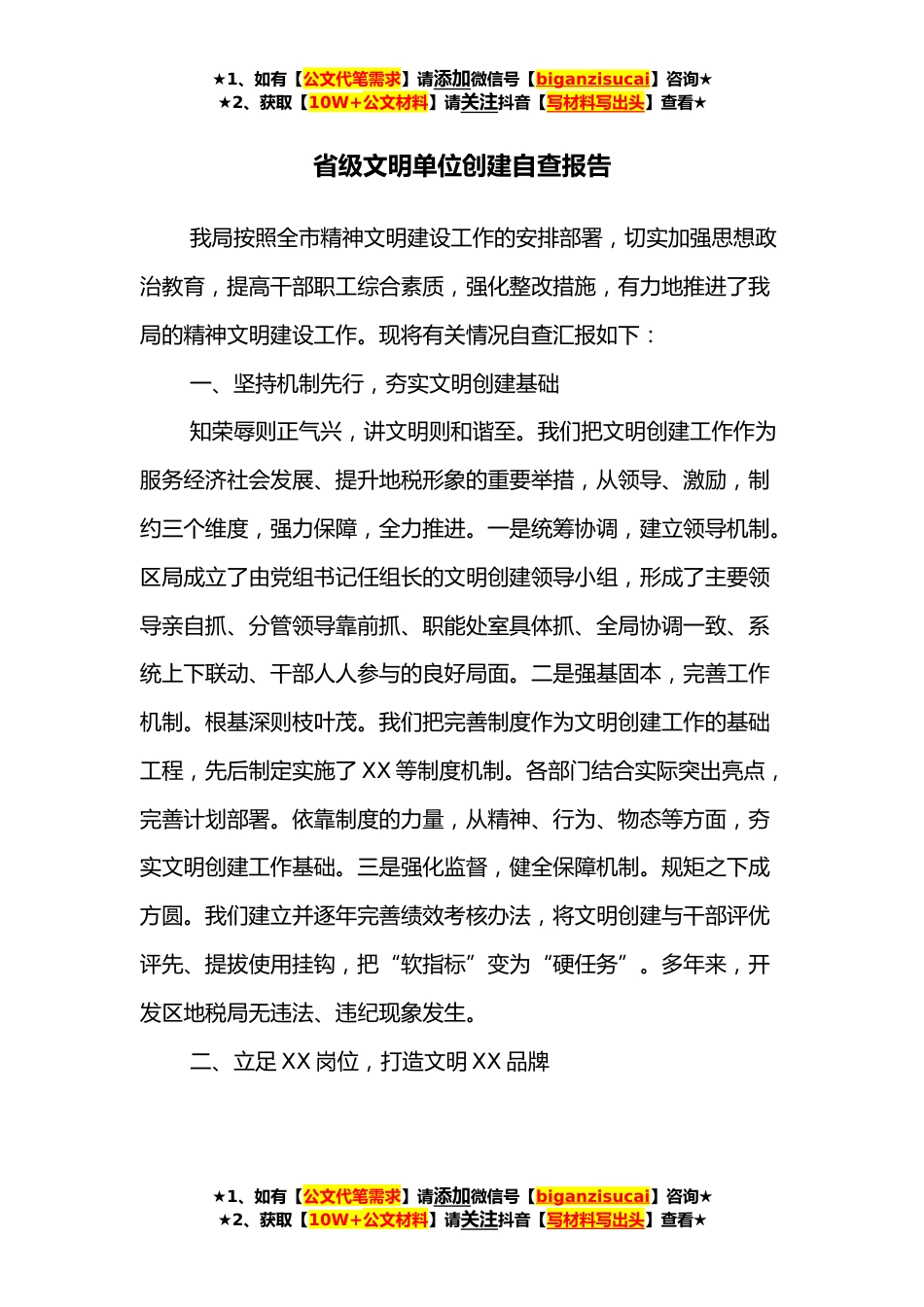 ★1、如有【公文代笔需求】请添加微信号【biganzisucai】咨询★★2、获取【10W+公文材料】请关注抖音【写材料写出头】查看★省级文明单位创建自查报告我局按照全市精神文明建设工作的安排部署,切实加强思想政治教育,提高干部职工综合素质,强化整改措施,有力地推进了我局的精神文明建设工作。现将有关情况自查汇报如下:一、坚持机制先行,夯实文明创建基础知荣辱则正气兴,讲文明则和谐至。我们把文明创建工作作为服务经济社会发展、提升地税形象的重要举措,从领导、激励,制约三个维度,强力保障,全力推进。一是统筹协调,建立领导机制。区局成立了由党组书记任组长的文明创建领导小组,形成了主要领导亲自抓、分管领导靠前抓、职能处室具体抓、全局协调一致、系统上下联动、干部人人参与的良好局面。二是...