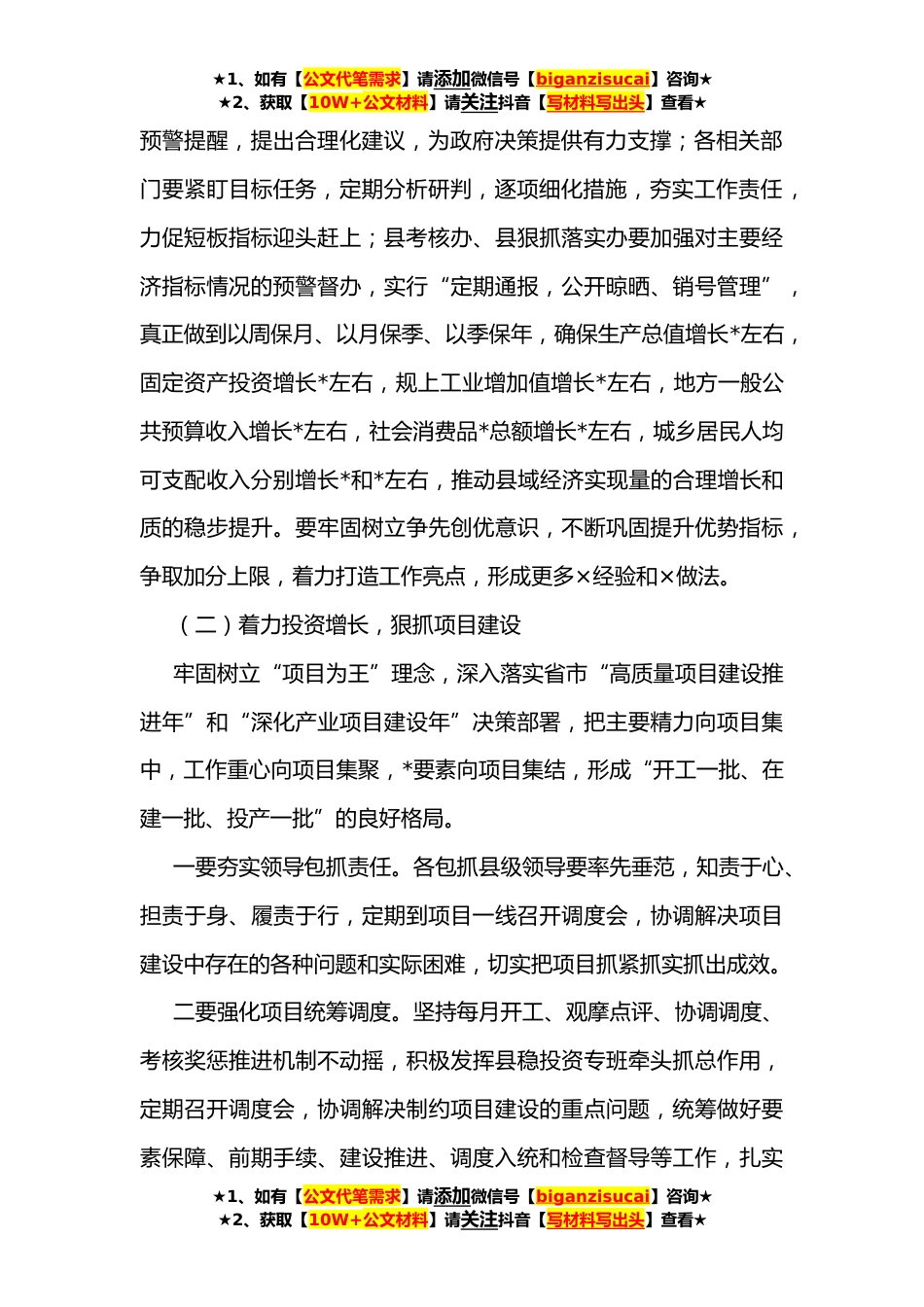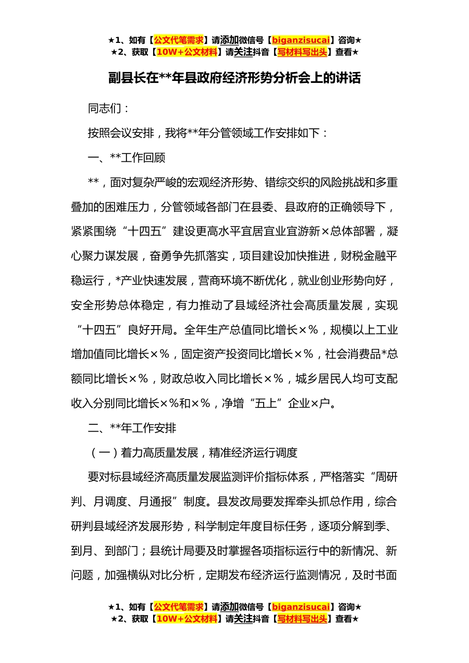 ★1、如有【公文代笔需求】请添加微信号【biganzisucai】咨询★★2、获取【10W+公文材料】请关注抖音【写材料写出头】查看★副县长在**年县政府经济形势分析会上的讲话同志们:按照会议安排,我将**年分管领域工作安排如下:一、**工作回顾**,面对复杂严峻的宏观经济形势、错综交织的风险挑战和多重叠加的困难压力,分管领域各部门在县委、县政府的正确领导下,紧紧围绕“十四五”建设更高水平宜居宜业宜游新×总体部署,凝心聚力谋发展,奋勇争先抓落实,项目建设加快推进,财税金融平稳运行,*产业快速发展,营商环境不断优化,就业创业形势向好,安全形势总体稳定,有力推动了县域经济社会高质量发展,实现“十四五”良好开局。全年生产总值同比增长×%,规模以上工业增加值同比增长×%,固定资产投资同比增...