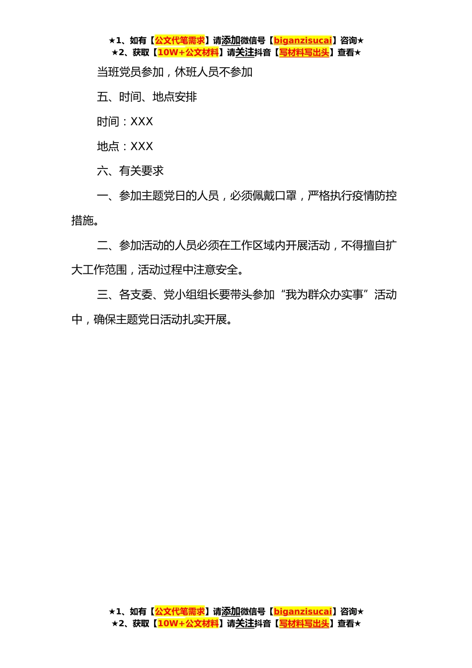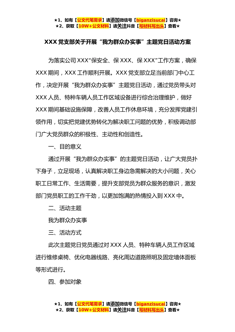 ★1、如有【公文代笔需求】请添加微信号【biganzisucai】咨询★★2、获取【10W+公文材料】请关注抖音【写材料写出头】查看★XXX党支部关于开展“我为群众办实事”主题党日活动方案为落实公司XXX“保安全、保XXX、保XXX”工作方案,确保XXX期间,XXX工作顺利开展。XXX党支部立足当前部门中心工作,决定开展“我为群众办实事”主题党日活动,通过党员带头对XXX人员、特种车辆人员工作区域设备进行综合治理维护,做好XXX期间基础设施保障,改善人员工作休息环境,充分发挥党建引领作用,切实把党建优势转化为解决职工问题的优势,积极调动部门广大党员群众的积极性、主动性和创造性。一、目的意义通过开展“我为群众办实事”的主题党日活动,让广大党员扑下身子,立足现场,认真解决职工身边急需解决的大小问题,关心...