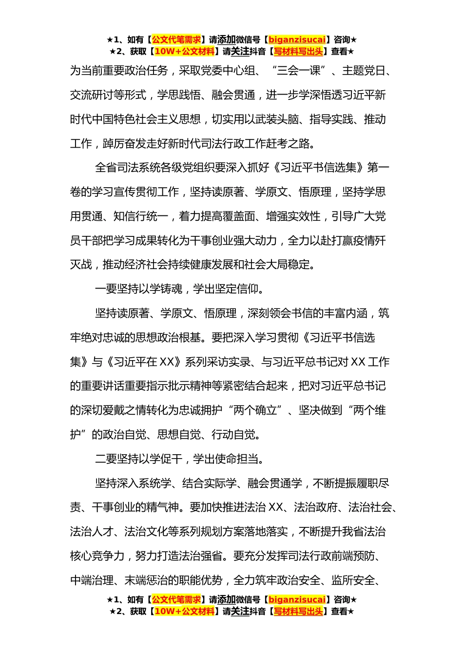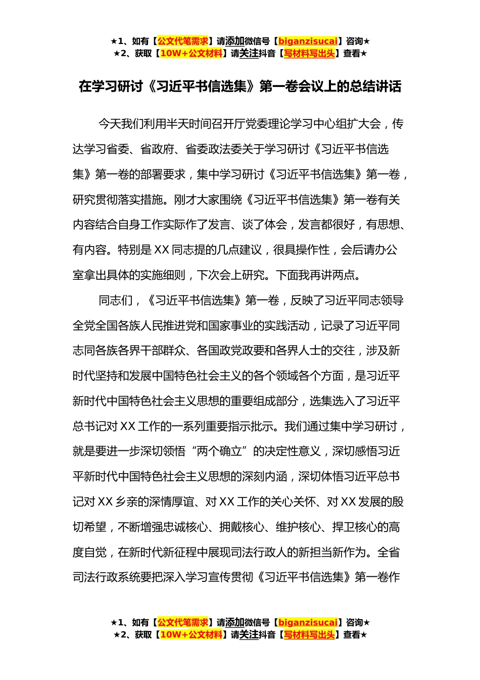 ★1、如有【公文代笔需求】请添加微信号【biganzisucai】咨询★★2、获取【10W+公文材料】请关注抖音【写材料写出头】查看★在学习研讨《习近平书信选集》第一卷会议上的总结讲话今天我们利用半天时间召开厅党委理论学习中心组扩大会,传达学习省委、省政府、省委政法委关于学习研讨《习近平书信选集》第一卷的部署要求,集中学习研讨《习近平书信选集》第一卷,研究贯彻落实措施。刚才大家围绕《习近平书信选集》第一卷有关内容结合自身工作实际作了发言、谈了体会,发言都很好,有思想、有内容。特别是XX同志提的几点建议,很具操作性,会后请办公室拿出具体的实施细则,下次会上研究。下面我再讲两点。同志们,《习近平书信选集》第一卷,反映了习近平同志领导全党全国各族人民推进党和国家事业的实践活动,记...