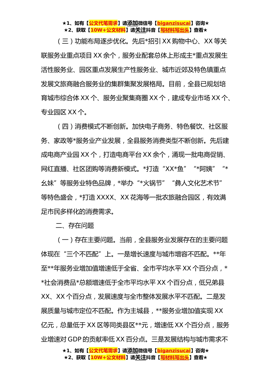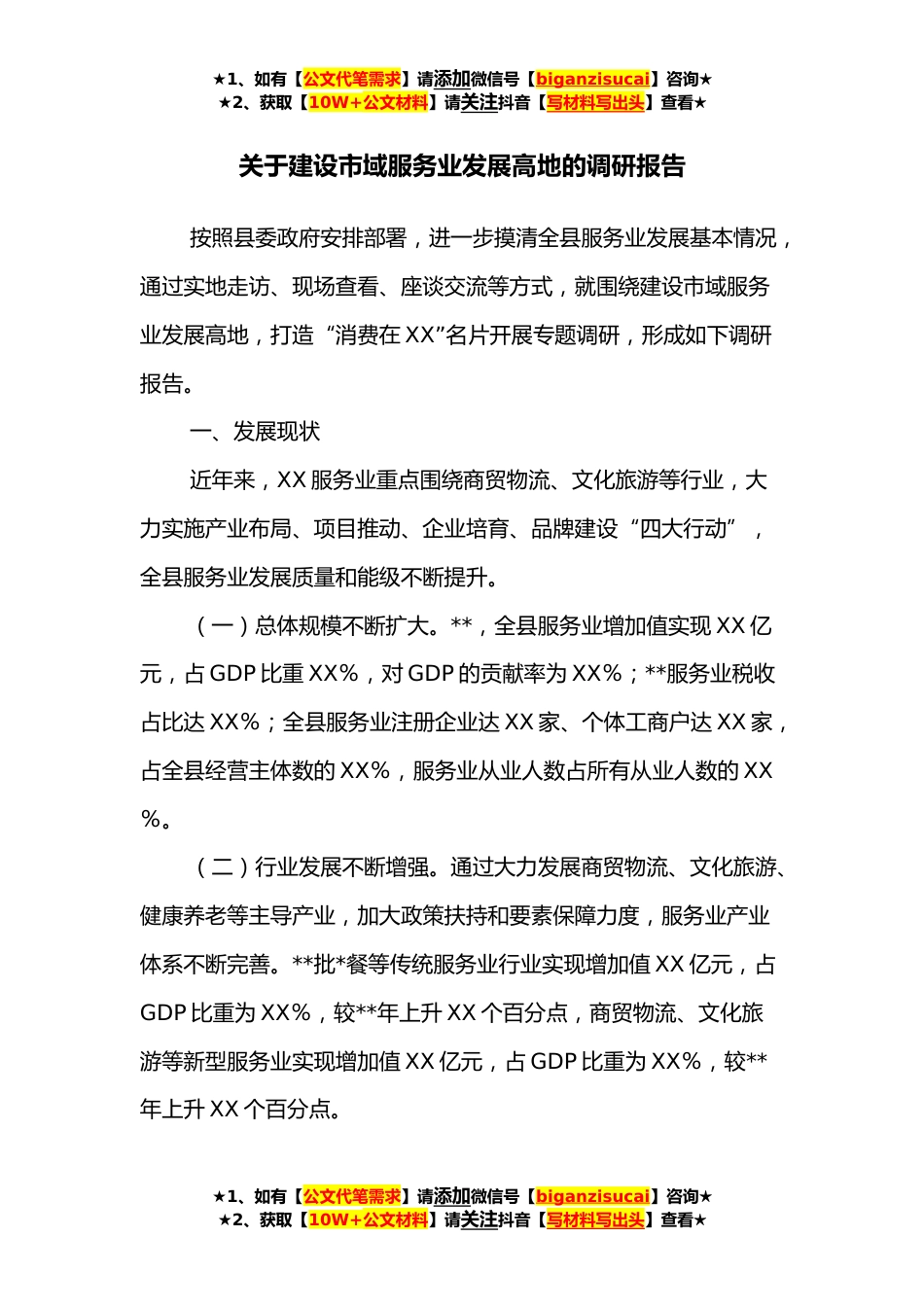 ★1、如有【公文代笔需求】请添加微信号【biganzisucai】咨询★★2、获取【10W+公文材料】请关注抖音【写材料写出头】查看★关于建设市域服务业发展高地的调研报告按照县委政府安排部署,进一步摸清全县服务业发展基本情况,通过实地走访、现场查看、座谈交流等方式,就围绕建设市域服务业发展高地,打造“消费在XX”名片开展专题调研,形成如下调研报告。一、发展现状近年来,XX服务业重点围绕商贸物流、文化旅游等行业,大力实施产业布局、项目推动、企业培育、品牌建设“四大行动”,全县服务业发展质量和能级不断提升。(一)总体规模不断扩大。**,全县服务业增加值实现XX亿元,占GDP比重XX%,对GDP的贡献率为XX%;**服务业税收占比达XX%;全县服务业注册企业达XX家、个体工商户达XX家,占全县经营主体数...