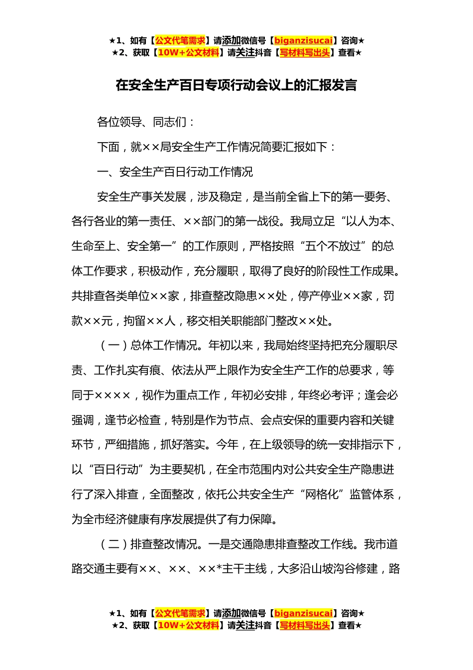 ★1、如有【公文代笔需求】请添加微信号【biganzisucai】咨询★★2、获取【10W+公文材料】请关注抖音【写材料写出头】查看★在安全生产百日专项行动会议上的汇报发言各位领导、同志们:下面,就××局安全生产工作情况简要汇报如下:一、安全生产百日行动工作情况安全生产事关发展,涉及稳定,是当前全省上下的第一要务、各行各业的第一责任、××部门的第一战役。我局立足“以人为本、生命至上、安全第一”的工作原则,严格按照“五个不放过”的总体工作要求,积极动作,充分履职,取得了良好的阶段性工作成果。共排查各类单位××家,排查整改隐患××处,停产停业××家,罚款××元,拘留××人,移交相关职能部门整改××处。(一)总体工作情况。年初以来,我局始终坚持把充分履职尽责、工作扎实有痕、依法...