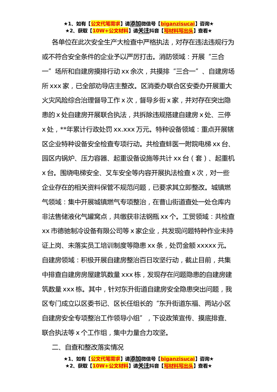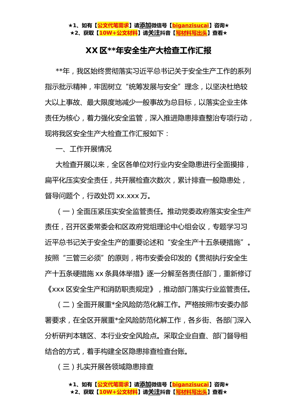 ★1、如有【公文代笔需求】请添加微信号【biganzisucai】咨询★★2、获取【10W+公文材料】请关注抖音【写材料写出头】查看★XX区**年安全生产大检查工作汇报**年,我区始终贯彻落实习近平总书记关于安全生产工作的系列指示批示精神,牢固树立“统筹发展与安全”理念,以坚决杜绝较大以上事故、最大限度地减少一般事故为总目标,以落实企业主体责任为核心,着力强化安全监管,深入推进隐患排查整治专项行动,现将我区安全生产大检查工作汇报如下:一、工作开展情况大检查开展以来,全区各单位对行业内安全隐患进行全面摸排,扁平化压实安全责任,共开展检查次数次,累计排查一般隐患处,督导问题个,行政处罚xx.xxx万。(一)全面压紧压实安全监管责任。推动党委政府落实安全生产责任,召开区委常委会和区政府党组...