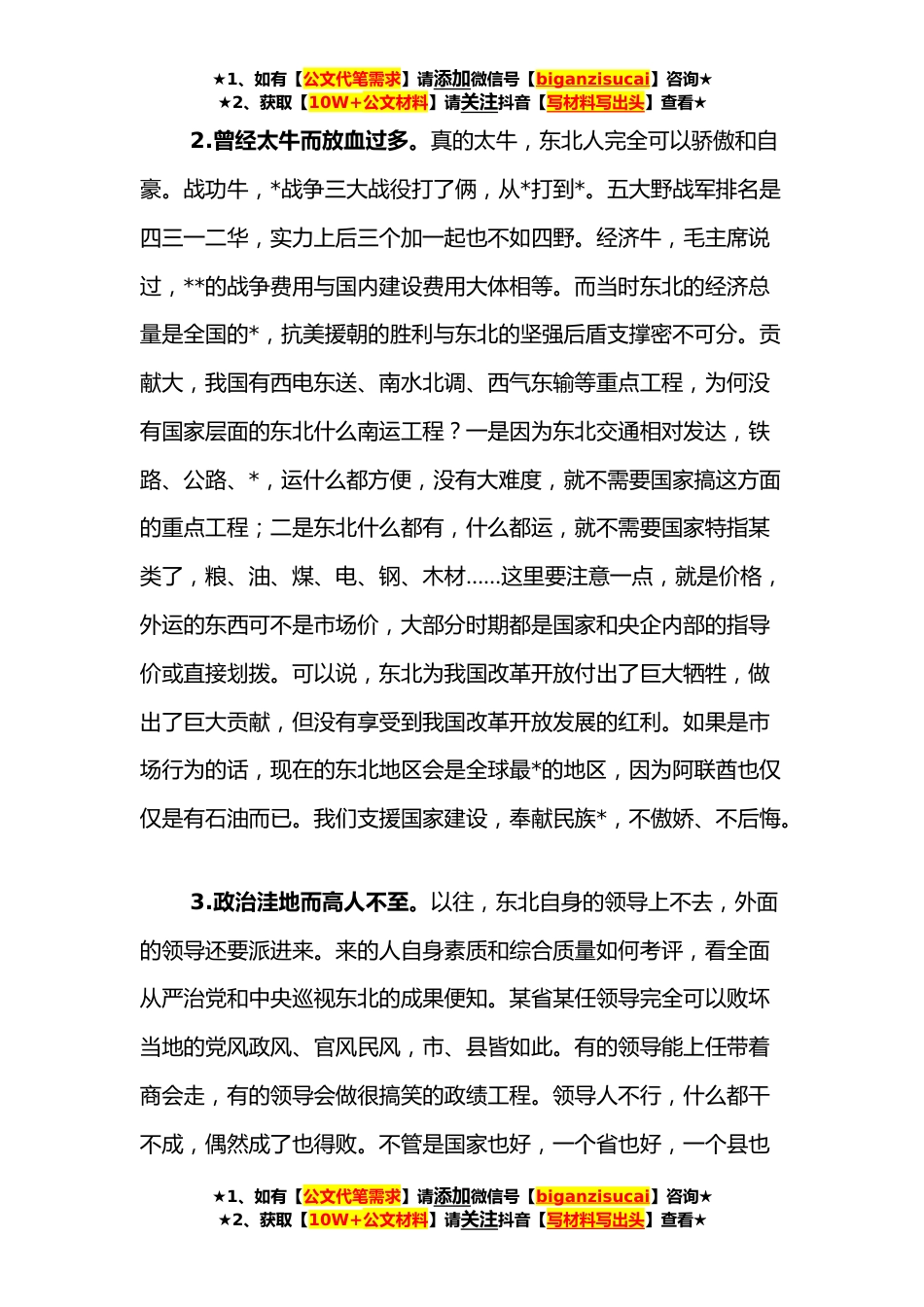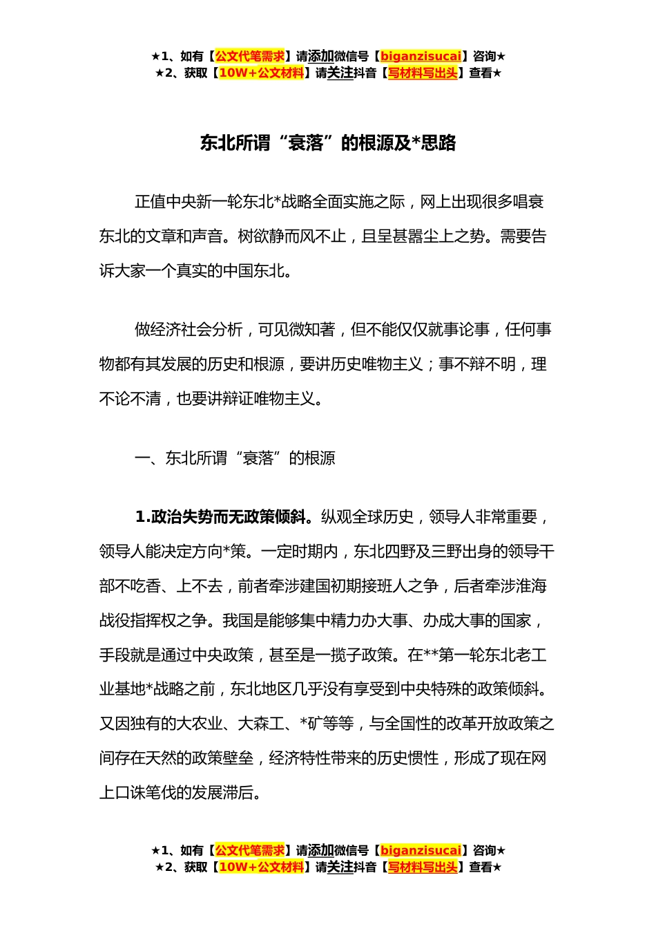 ★1、如有【公文代笔需求】请添加微信号【biganzisucai】咨询★★2、获取【10W+公文材料】请关注抖音【写材料写出头】查看★东北所谓“衰落”的根源及*思路正值中央新一轮东北*战略全面实施之际,网上出现很多唱衰东北的文章和声音。树欲静而风不止,且呈甚嚣尘上之势。需要告诉大家一个真实的中国东北。做经济社会分析,可见微知著,但不能仅仅就事论事,任何事物都有其发展的历史和根源,要讲历史唯物主义;事不辩不明,理不论不清,也要讲辩证唯物主义。一、东北所谓“衰落”的根源1.政治失势而无政策倾斜。纵观全球历史,领导人非常重要,领导人能决定方向*策。一定时期内,东北四野及三野出身的领导干部不吃香、上不去,前者牵涉建国初期接班人之争,后者牵涉淮海战役指挥权之争。我国是能够集中精力办大事、...