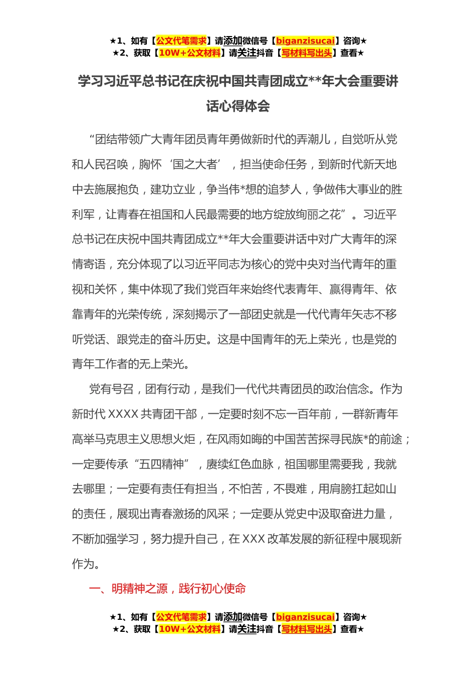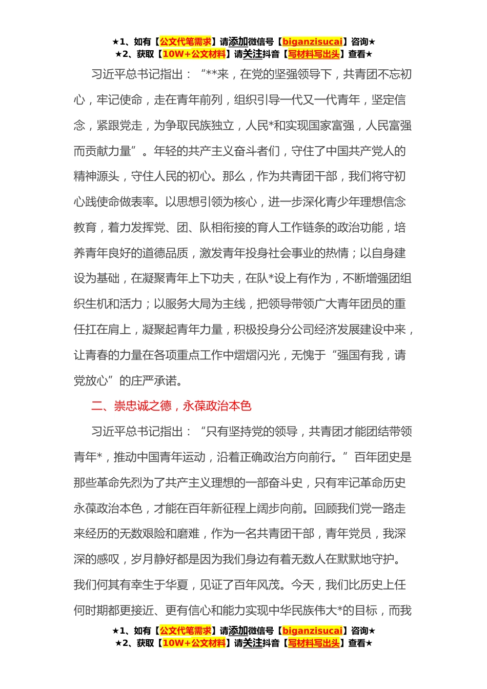 ★1、如有【公文代笔需求】请添加微信号【biganzisucai】咨询★★2、获取【10W+公文材料】请关注抖音【写材料写出头】查看★学习习近平总书记在庆祝中国共青团成立**年大会重要讲话心得体会“团结带领广大青年团员青年勇做新时代的弄潮儿,自觉听从党和人民召唤,胸怀‘国之大者’,担当使命任务,到新时代新天地中去施展抱负,建功立业,争当伟*想的追梦人,争做伟大事业的胜利军,让青春在祖国和人民最需要的地方绽放绚丽之花”。习近平总书记在庆祝中国共青团成立**年大会重要讲话中对广大青年的深情寄语,充分体现了以习近平同志为核心的党中央对当代青年的重视和关怀,集中体现了我们党百年来始终代表青年、赢得青年、依靠青年的光荣传统,深刻揭示了一部团史就是一代代青年矢志不移听党话、跟党走的奋斗历史...