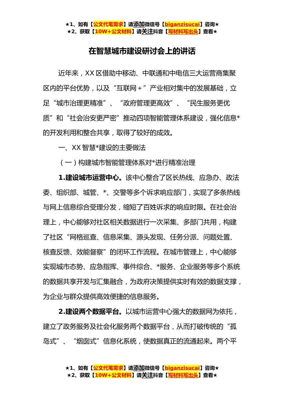 ★1、如有【公文代笔需求】请添加微信号【biganzisucai】咨询★★2、获取【10W+公文材料】请关注抖音【写材料写出头】查看★在智慧城市建设研讨会上的讲话近年来,XX区借助中移动、中联通和中电信三大运营商集聚区内的平台优势,以及“互联网+”产业相对集中的发展基础,立足“城市治理更精准”、“政府管理更高效”、“民生服务更优质”和“社会治安更严密”推动四项智能管理体系建设,强化信息*的开发利用和整合共享,取得了较好的成效。一、XX智慧*建设的主要做法(一)构建城市智能管理体系对*进行精准治理1.建设城市运营中心。该中心整合了区长热线、应急办、政法委、组织部、城管、*、交警等多个诉求响应部门,实现了多条热线与网上信息综合受理分发,缩短了百姓诉求的响应时限。在社会治理上,中心能够对...