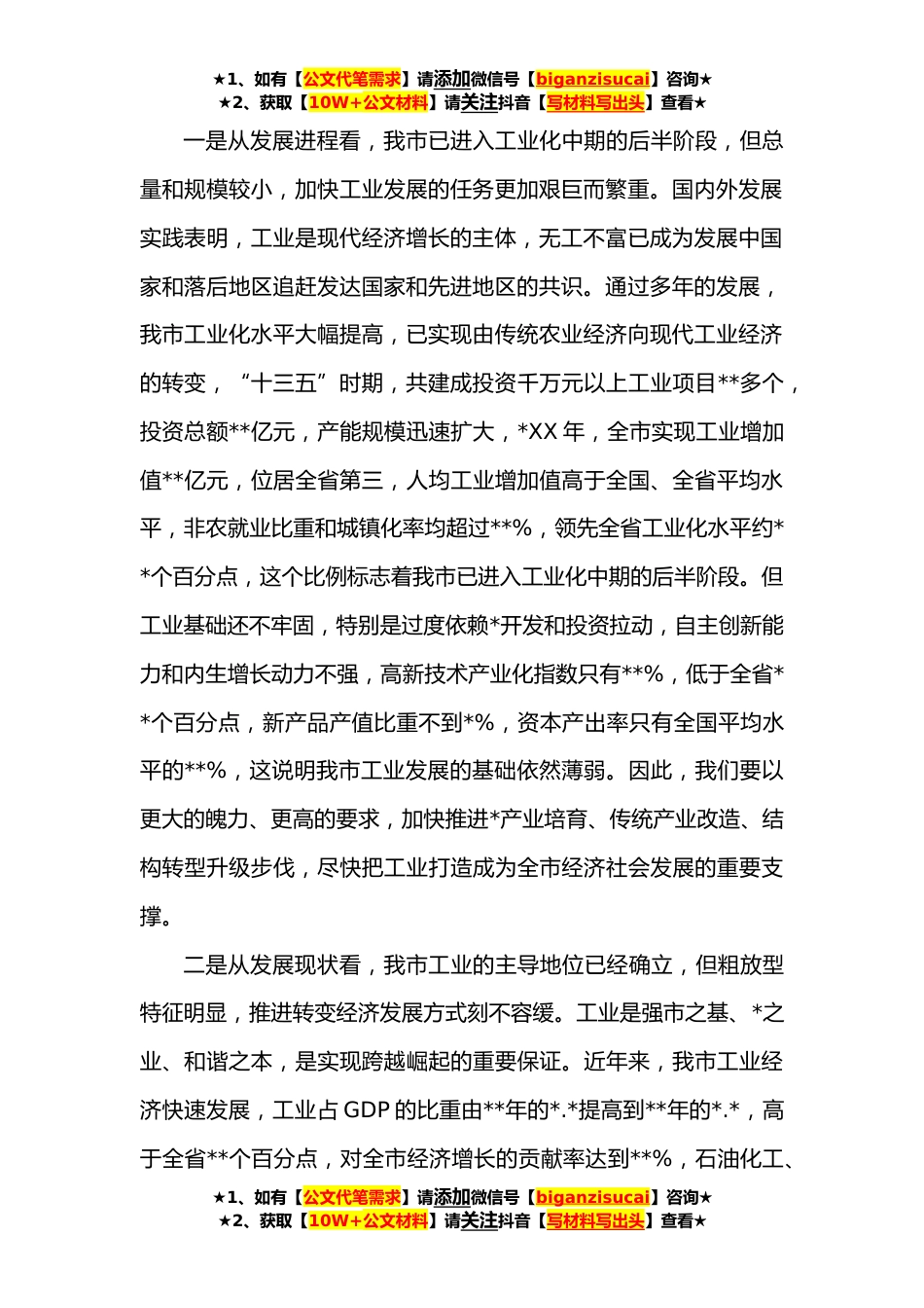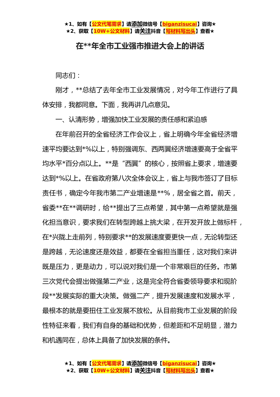 ★1、如有【公文代笔需求】请添加微信号【biganzisucai】咨询★★2、获取【10W+公文材料】请关注抖音【写材料写出头】查看★在**年全市工业强市推进大会上的讲话同志们:刚才,**总结了去年全市工业发展情况,对今年工作进行了具体安排,我都同意。下面,我再讲几点意见。一、认清形势,增强加快工业发展的责任感和紧迫感在年前召开的全省经济工作会议上,省上明确今年全省经济增速平均要达到*%以上,特别强调东、西两翼经济增速要高于全省平均水平*百分点以上。**是“西翼”的核心,按照省上要求,增速要达到*%以上。在省政府第八次全体会议上,省上与我市签订了目标责任书,确定今年我市第二产业增速是**%,居全省之首。前天,省委**在**调研时,给**提出了三点希望,其中第一点希望就是强化担当意识,要求我们...