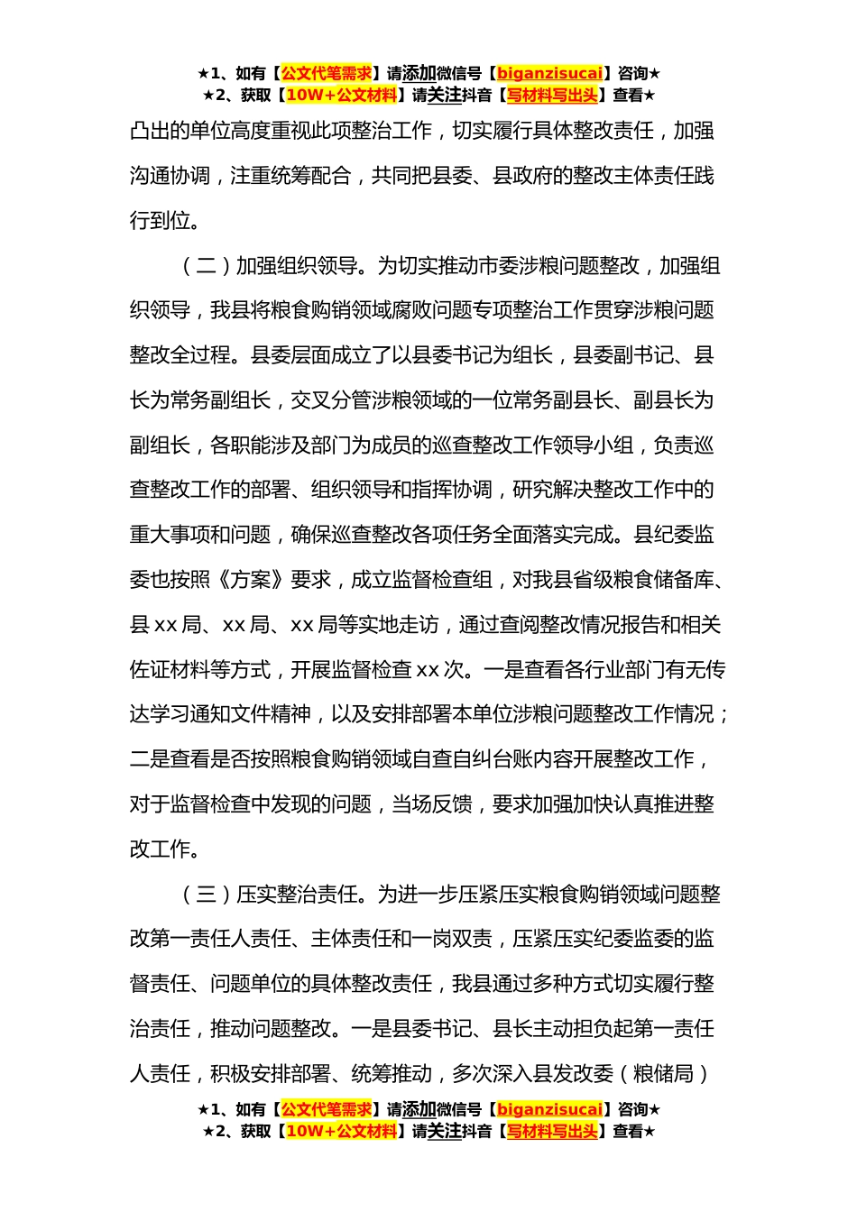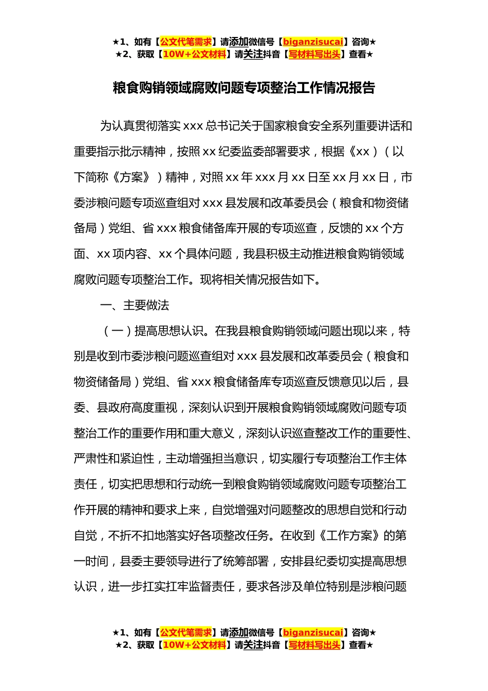 ★1、如有【公文代笔需求】请添加微信号【biganzisucai】咨询★★2、获取【10W+公文材料】请关注抖音【写材料写出头】查看★粮食购销领域腐败问题专项整治工作情况报告为认真贯彻落实xxx总书记关于国家粮食安全系列重要讲话和重要指示批示精神,按照xx纪委监委部署要求,根据《xx)(以下简称《方案》)精神,对照xx年xxx月xx日至xx月xx日,市委涉粮问题专项巡查组对xxx县发展和改革委员会(粮食和物资储备局)党组、省xxx粮食储备库开展的专项巡查,反馈的xx个方面、xx项内容、xx个具体问题,我县积极主动推进粮食购销领域腐败问题专项整治工作。现将相关情况报告如下。一、主要做法(一)提高思想认识。在我县粮食购销领域问题出现以来,特别是收到市委涉粮问题巡查组对xxx县发展和改革委员会(粮食和物资储备局...