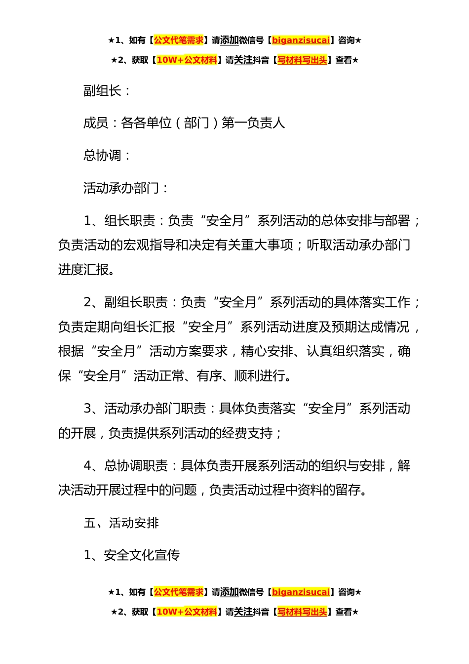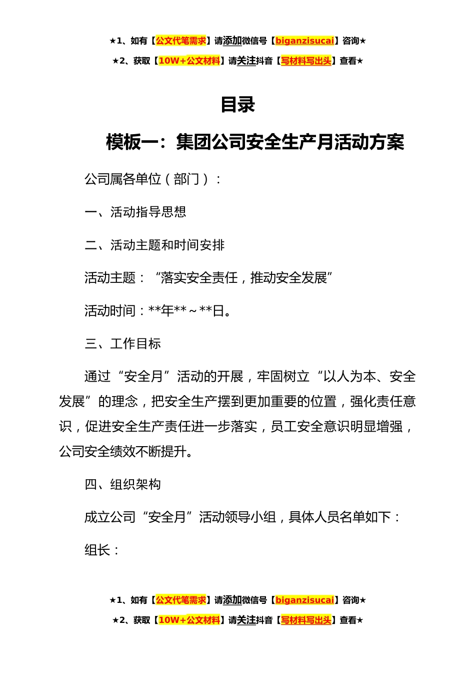 ★1、如有【公文代笔需求】请添加微信号【biganzisucai】咨询★★2、获取【10W+公文材料】请关注抖音【写材料写出头】查看★目录模板一:集团公司安全生产月活动方案公司属各单位(部门):一、活动指导思想二、活动主题和时间安排活动主题:“落实安全责任,推动安全发展”活动时间:**年**~**日。三、工作目标通过“安全月”活动的开展,牢固树立“以人为本、安全发展”的理念,把安全生产摆到更加重要的位置,强化责任意识,促进安全生产责任进一步落实,员工安全意识明显增强,公司安全绩效不断提升。四、组织架构成立公司“安全月”活动领导小组,具体人员名单如下:组长:★1、如有【公文代笔需求】请添加微信号【biganzisucai】咨询★★2、获取【10W+公文材料】请关注抖音【写材料写出头】查看★★1、如有...