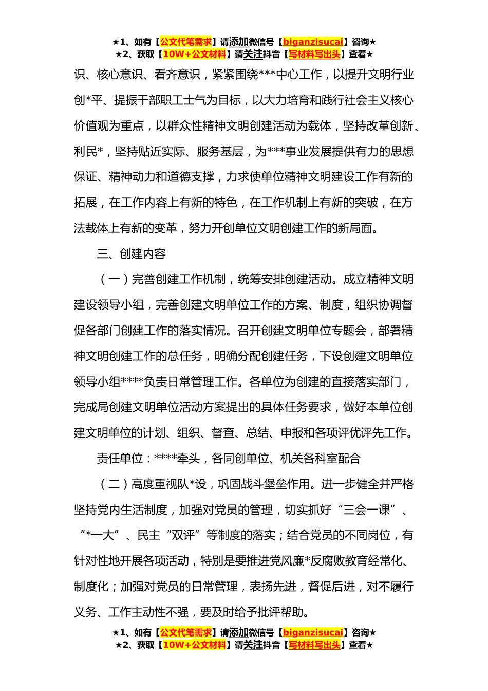 ★1、如有【公文代笔需求】请添加微信号【biganzisucai】咨询★★2、获取【10W+公文材料】请关注抖音【写材料写出头】查看★某局**年度全国文明单位创建工作方案**年是党的二十大召开之年,也是“十四五”规划实施的关键之年,为深入贯彻习近平新时代中国特色社会主义思想,认真学习党的十九大历次会议精神,切实增强政治意识、大局意识、核心意识、看齐意识,推进我局**年度全国文明单位创建工作,为全市**事业发展提供有力的思想保证、精神动力和道德支撑。根据中央、省、市文明办的文件有关要求,结合我局实际,制定本工作计划。一、指导思想为深入贯彻习近平新时代中国特色社会主义思想和党的十九大历次会议精神,紧紧围绕迎接宣传贯彻党的二十大这条主线,落实《关于深化新时代文明单位创建工作意见》,推动新...